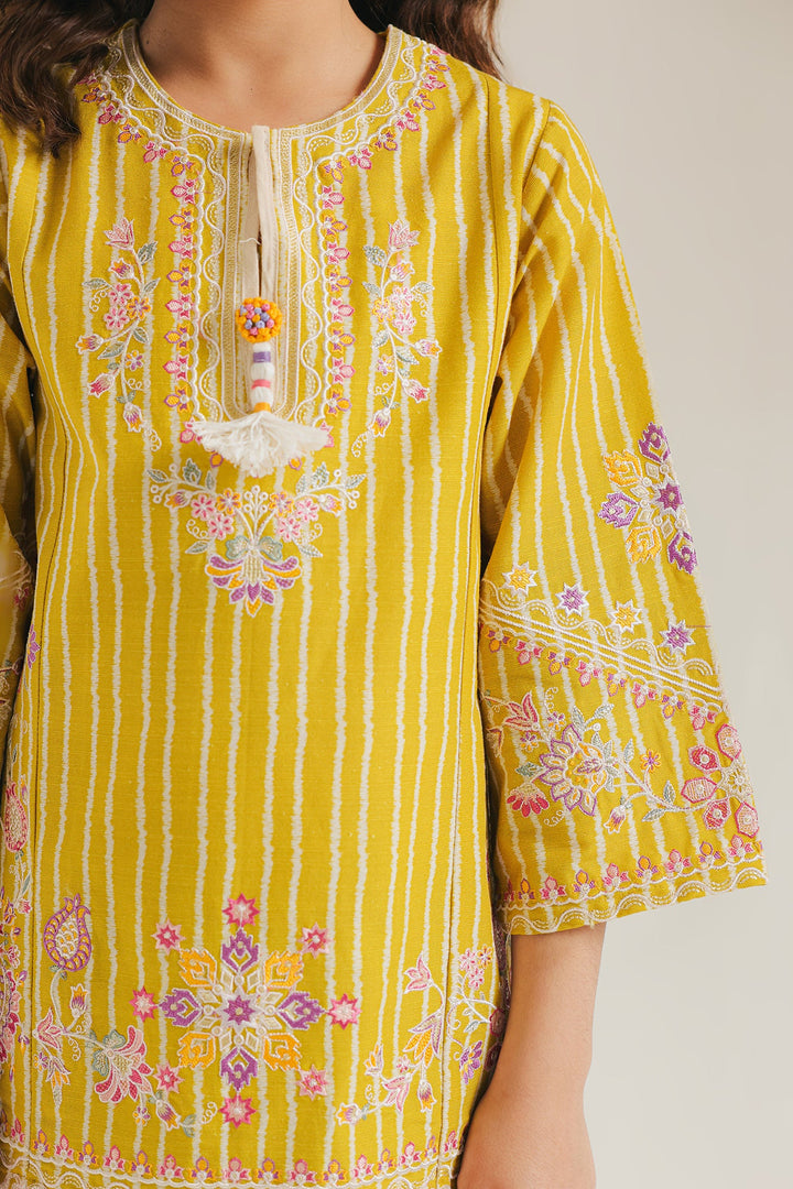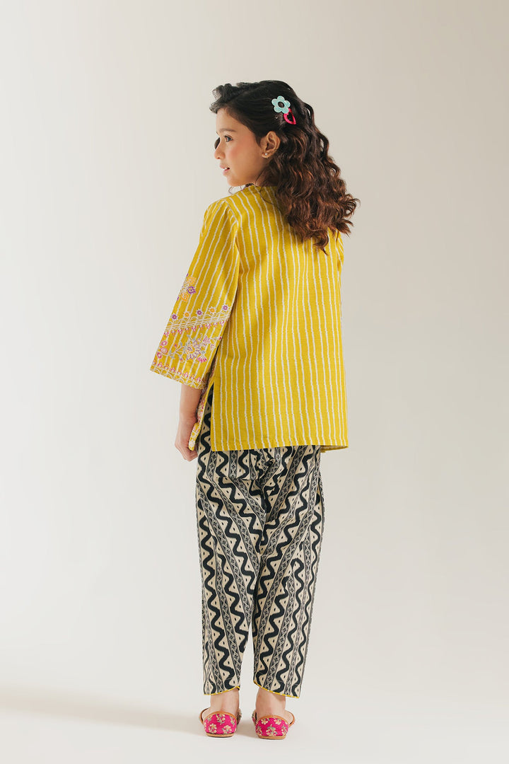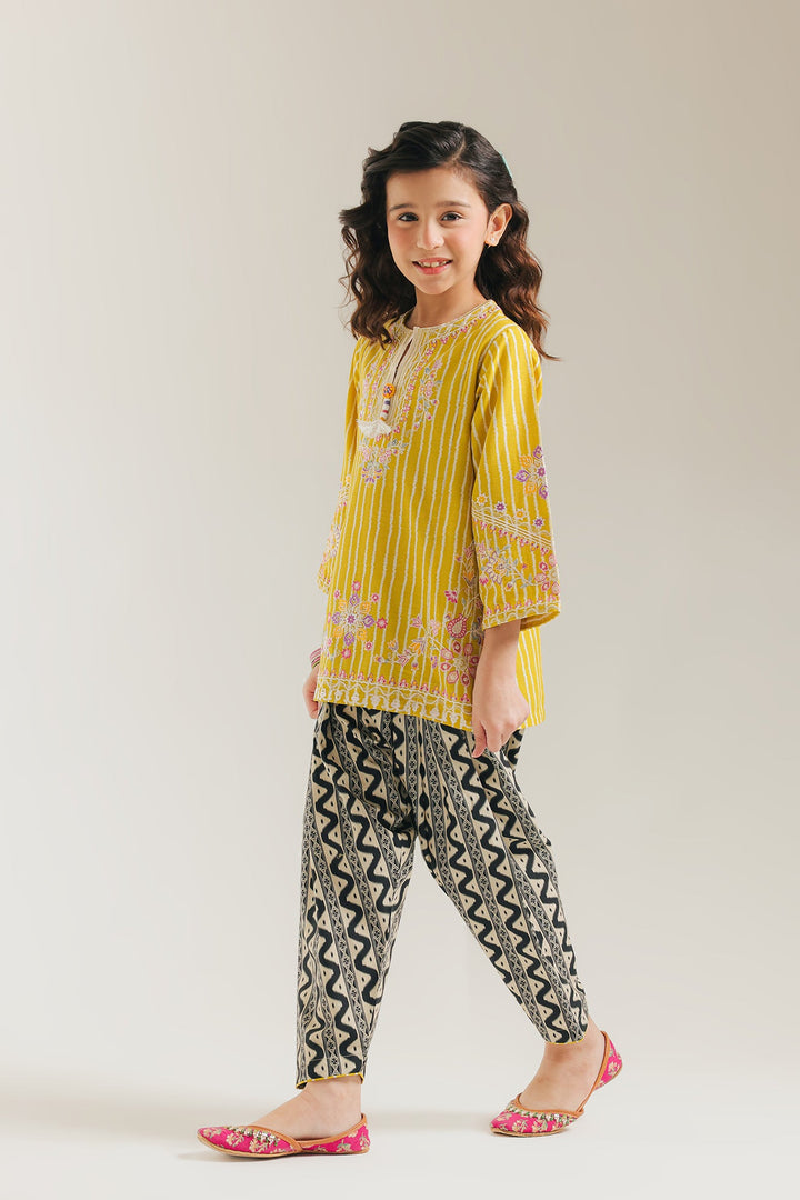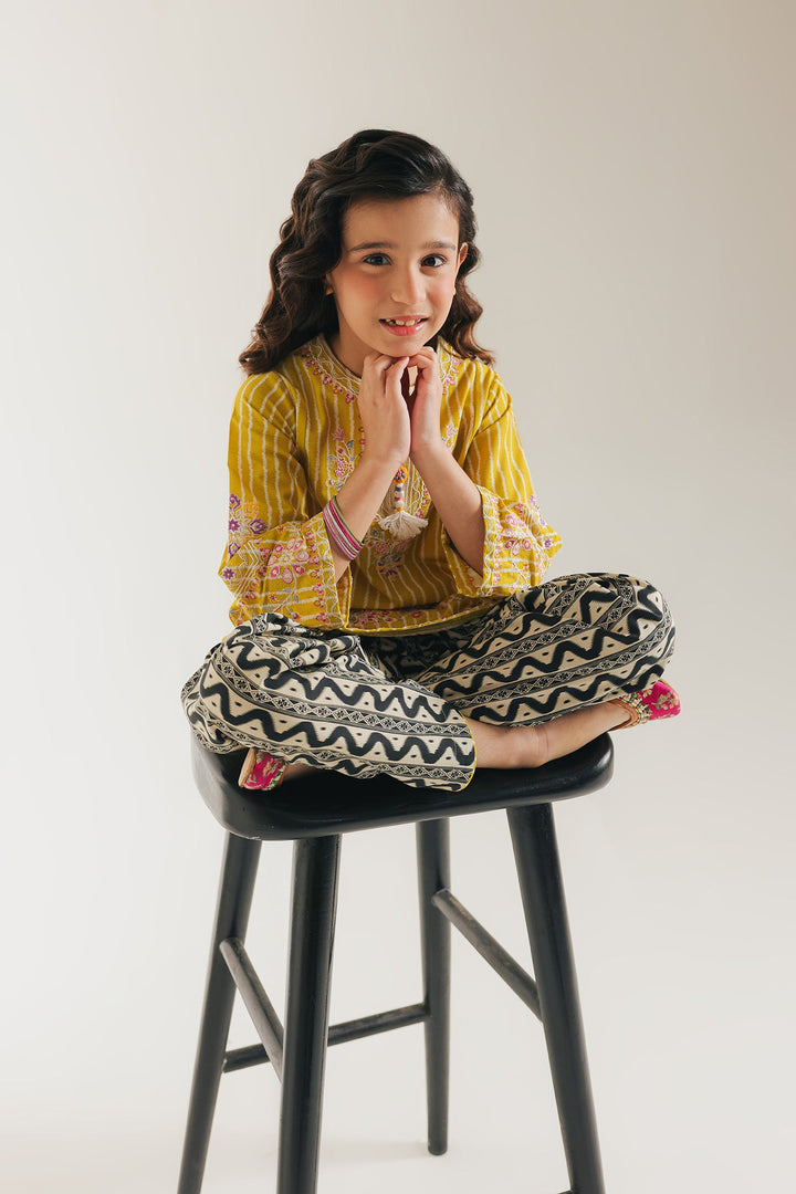 Enliven a young one's wardrobe with this vibrant and playful mustard-yellow embroidered suit. The short, festive kurta is rendered in a sunny yellow fabric and features subtle tonal vertical stripes. It is richly adorned with thread embroidery in white and pink floral patterns across the yoke, sleeves, and hem. The V-slit neckline includes decorative tassel detail. The ensemble is completed by coordinating shalwar. The shalwar offer a lively contrast with their black and cream geometric wave-like print, making this a fun and festive choice.