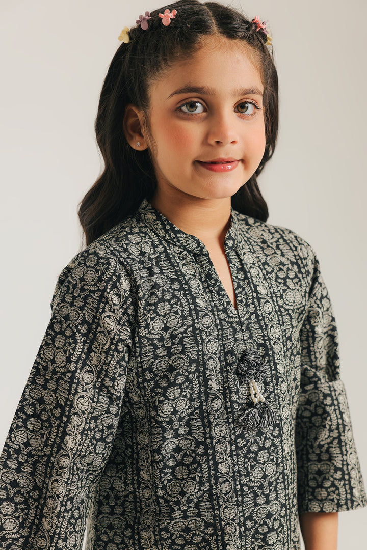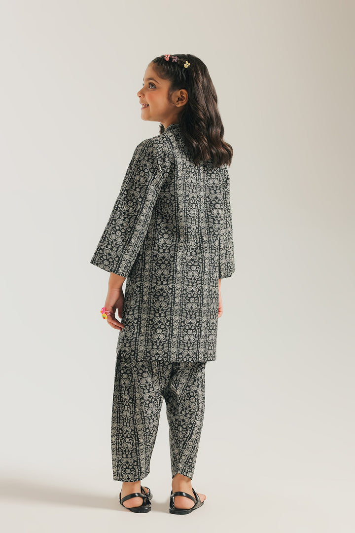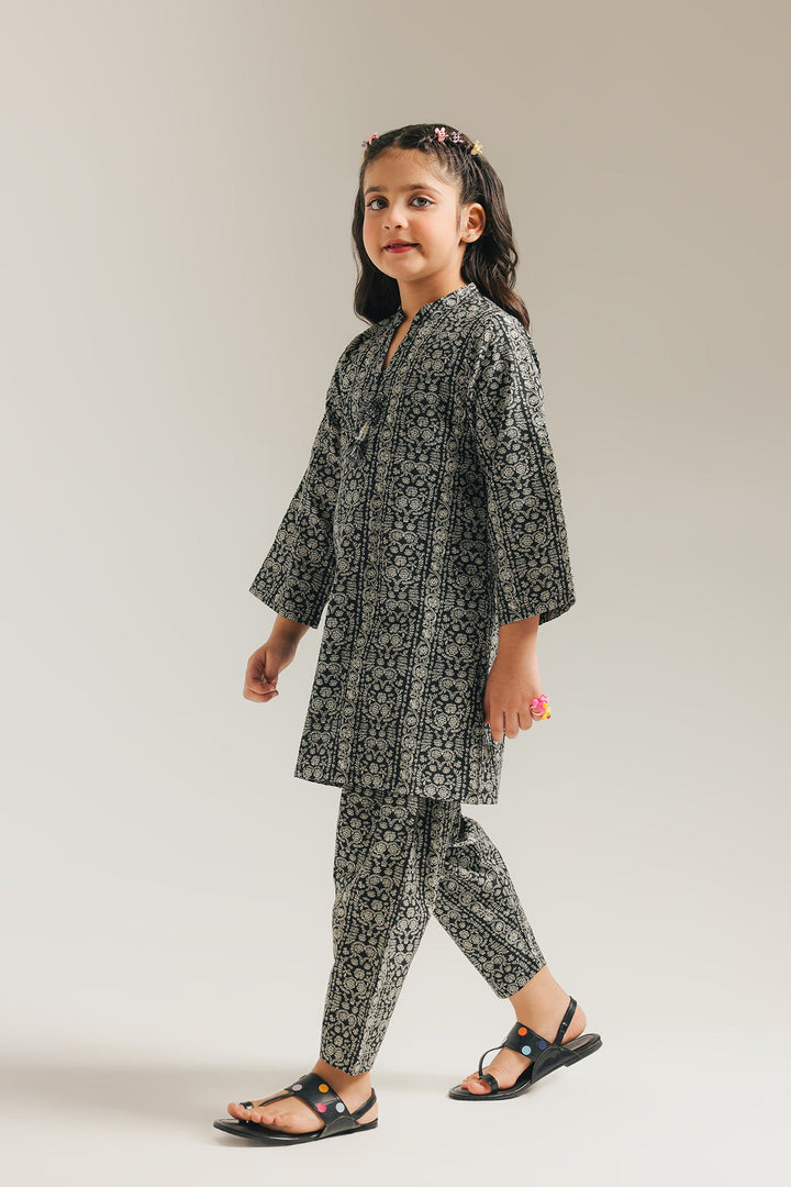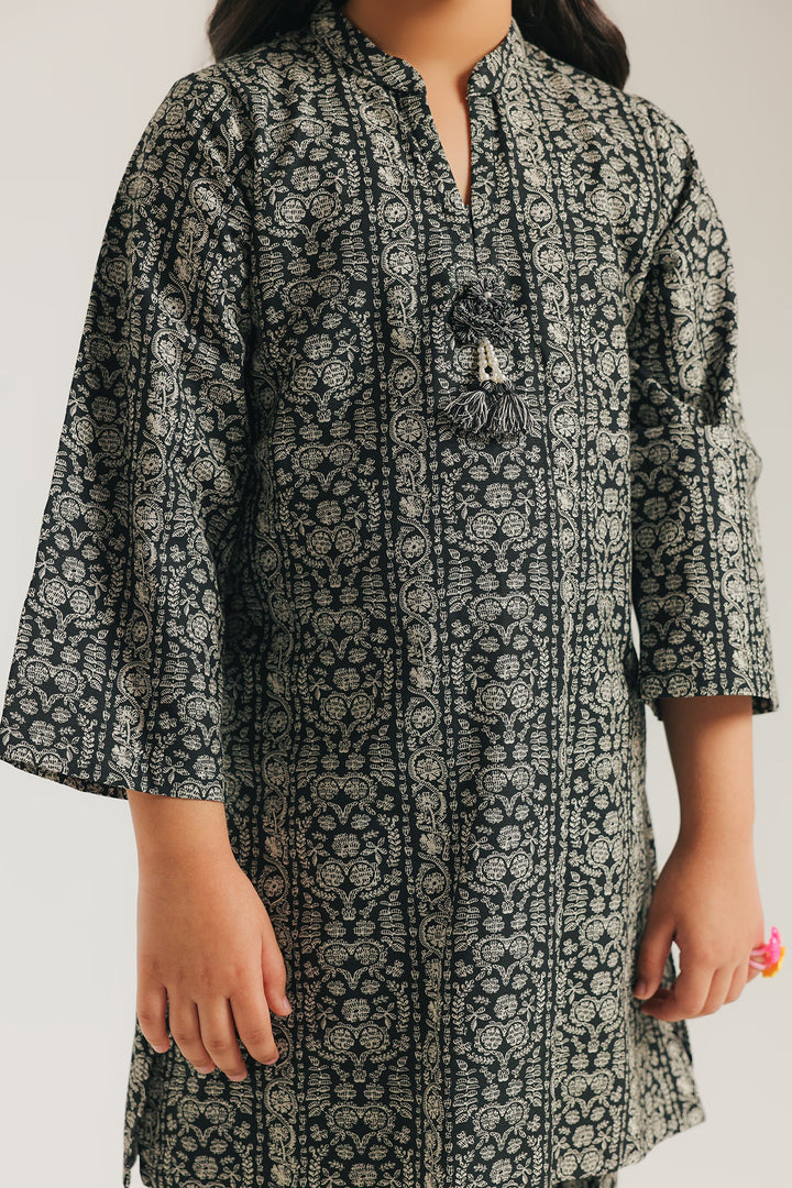 Give her a sophisticated look with this stylish black printed suit. The ensemble features a beautifully coordinated black kameez and matching shalwar, both adorned with an intricate white floral pattern. A subtle tassel detail at the neckline of the kameez adds a touch of playful charm. This suit is perfect for a special event or a festive gathering, offering a blend of traditional elegance and modern style.