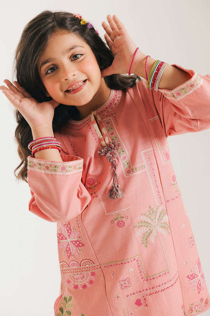 Sprinkle some playful charm into their collection with this delightful pink embroidered suit. The short, straight fit kurti is rendered in a soft coral pink fabric and features short sleeves. The front of the top is embellished with intricate multi-colored thread embroidery in various geometric and stylized palm tree motifs. A fun tassel accent hangs from the rounded neckline. The set is completed with comfortable, gathered shalwar featuring an all-over cream and pink spotted/dot print. This bright, coordinated look is perfect for celebrating special moments in comfortable style.