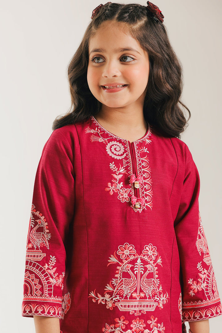 Introduce vibrant tradition to their closet with this gorgeous magenta embroidered suit. The ensemble features a short, straight-cut kurti in a striking crimson/magenta hue. It is richly adorned with intricate embroidery across the neckline, front, and sleeves, showcasing beautiful traditional motifs, including stylized peacocks or birds. The neckline is finished with decorative trim and tassels. The suit is completed with comfortable shalwar in the same deep magenta, featuring coordinating embroidery along the hem. This outfit is perfect for festive wear, offering a blend of comfort and eye-catching detail.