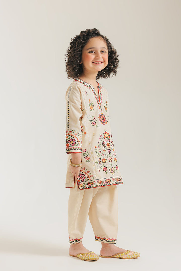 Bring festive flair to your little one's wardrobe with this gorgeous embroidered suit. The charming off-white kurta is a masterpiece of vibrant artistry, adorned with richly colored floral and paisley embroidery in shades of red, orange, pink, and green that beautifully adorns the front, and sleeves. The ensemble is perfectly completed with comfortable, straight-fit shalwar in a matching light beige, creating a bright and captivating traditional look.