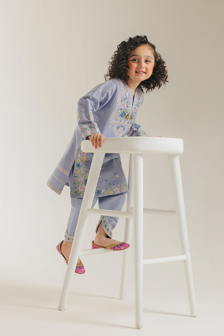 Dress your little darling in the sweet serenity of this beautiful embroidered suit. The charming lilac-blue kurta is richly embellished with delicate floral and butterfly embroidery in shades of pink, blue, and green, which cascade down the front and adorn the sleeves. The neckline is a centerpiece of intricate floral work, complete with a tiny decorative tassel. The ensemble is perfectly completed with comfortable shalwar in a matching solid color, featuring complementary embroidery at the hem for a cohesive and enchanting traditional look.