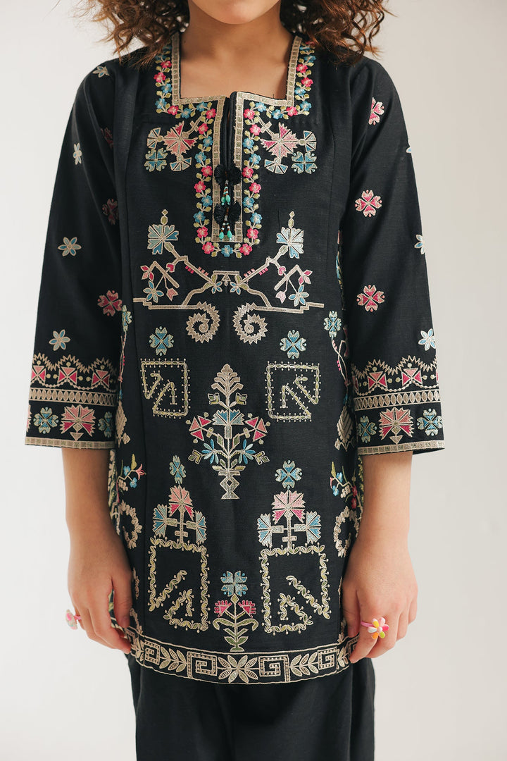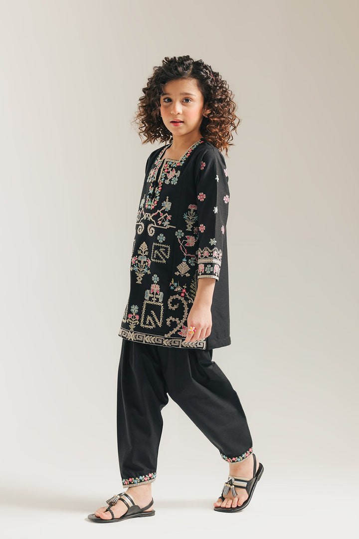 Introducing our exquisitely crafted embroidered suit, designed for timeless style. This charming two-piece set features a black khaddar shirt adorned with intricate floral and geometric embroidery in a vibrant palette of pink, green, blue, and off-white. The coordinating black shalwar complete the look, creating a cohesive and elegant ensemble that's perfect for any festive occasion.