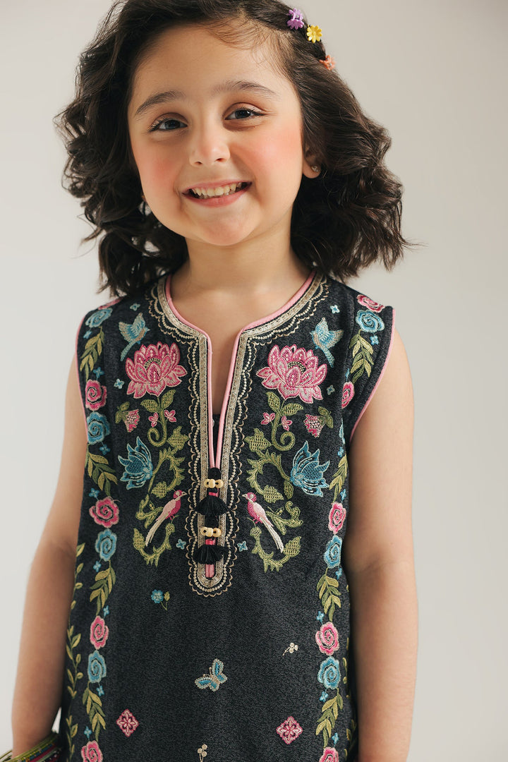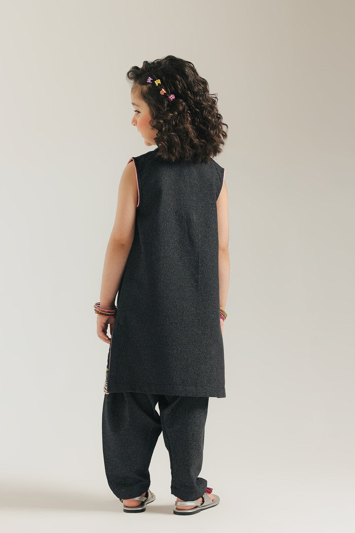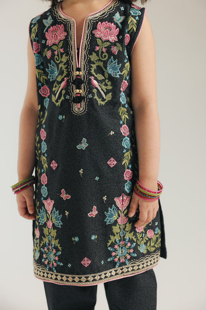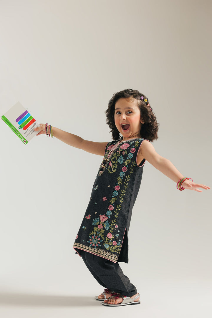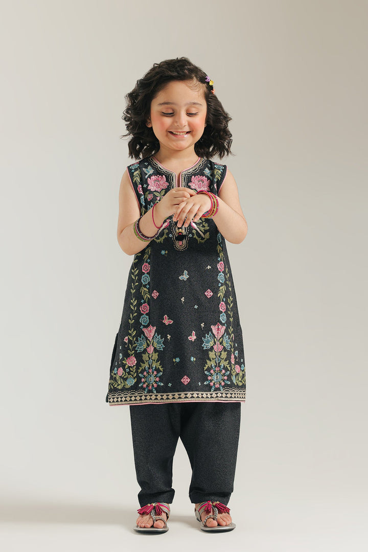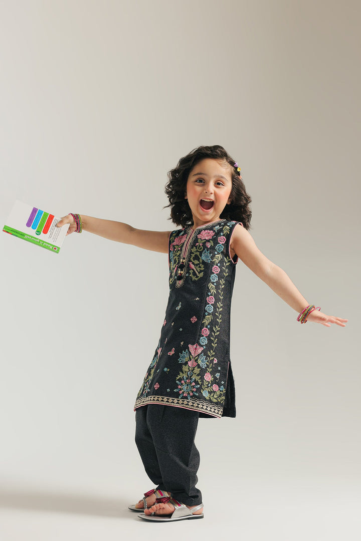 Dress your little one in this enchanting embroidered suit, a perfect blend of comfort and festive style. The deep black sleeveless shirt is beautifully adorned with intricate floral and vine embroidery in vibrant shades of pink, turquoise, and green. A touch of delicate beadwork along the neckline adds a festive glimmer. The ensemble is completed with straight shalwar in a matching dark shade, creating a polished and playful look. This suit is an ideal choice for a special occasion or a celebration.