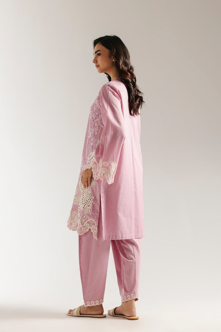 This elegant embroidered suit is a beautiful blend of soft color and intricate artistry. The delicate pink kurta features a beautiful contrast of fine floral embroidery on the bodice and a stunning, bold cutwork and embroidery design on the hem. Paired with a perfectly coordinated shalwar, this ensemble offers a sophisticated and graceful look.