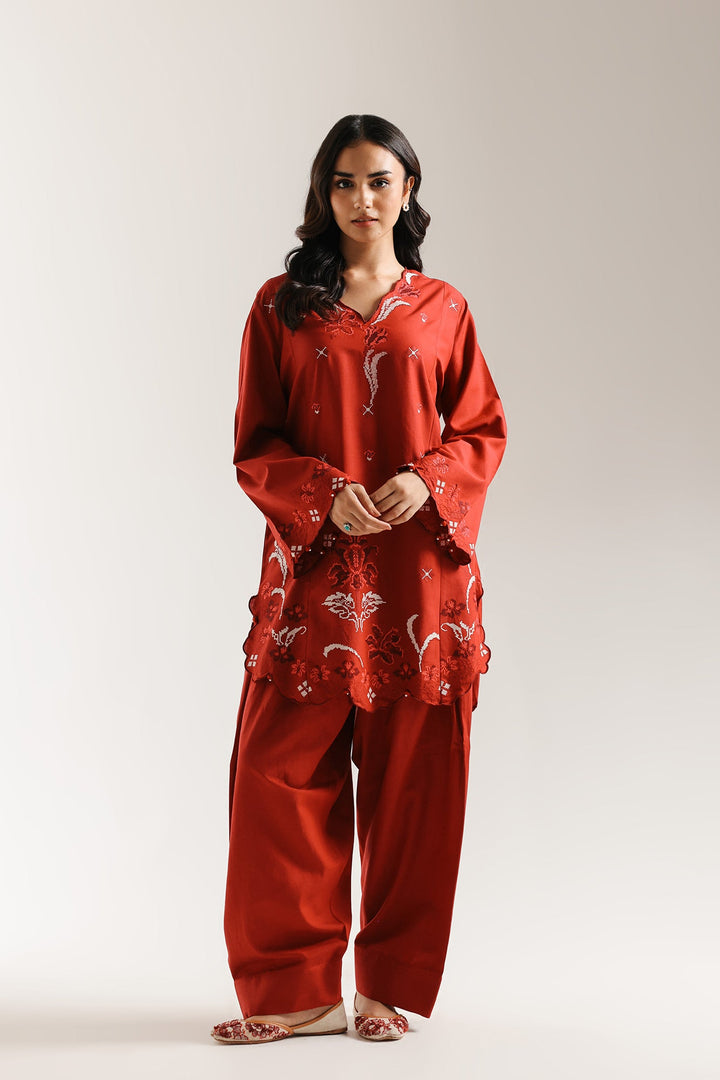 Ignite a festive mood with this stunning, deep red embroidered suit. The short loose fit shirt features a beautifully scalloped hem and is exquisitely adorned with intricate white and monochrome embroidery in elegant floral and vine patterns that gracefully trail across the front and sleeves. The neckline is defined by a deep V-cut and features contrasting stitch detailing. The ensemble is perfectly completed with voluminous, wide leg shalwar, creating a vibrant and cohesive look for any celebration.