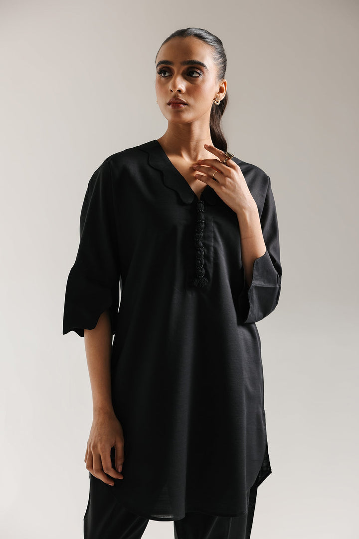 Experience modern simplicity and chic detail with this all-black solid suit. The short, straight-cut kurti is crafted from a solid black fabric and features an elegant scalloped V-neckline. The neckline and three-quarter sleeves are finished with matching scalloped edging, adding subtle texture and detail to the monochromatic look. The ensemble is completed by straight-fit trousers. These black trousers feature a modern slit detail at the hem, which elevates the classic silhouette. This suit is a timeless and versatile choice for effortlessly refined daily wear.