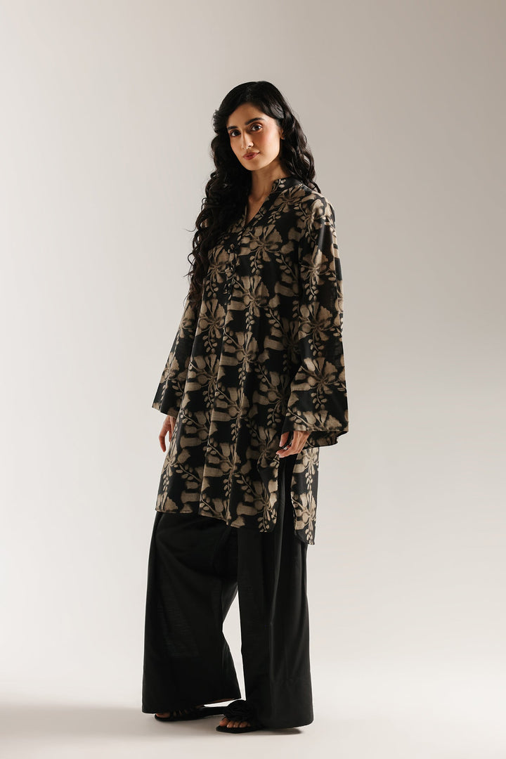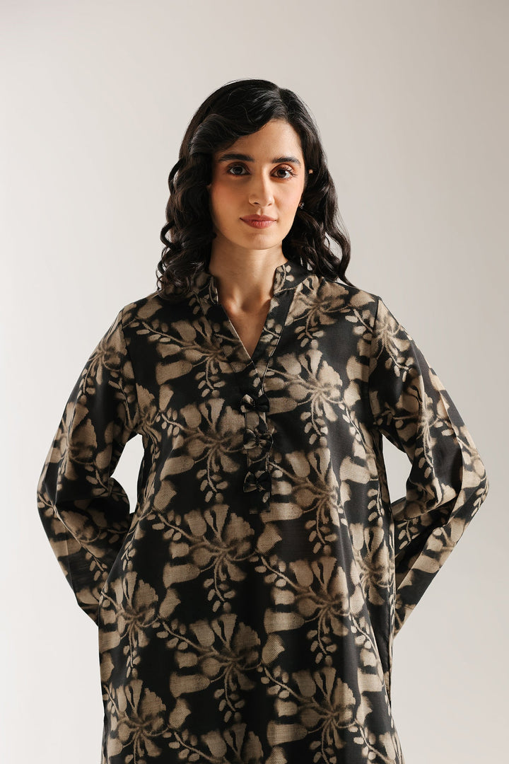 Step out in sophisticated style with this captivating printed suit. This two-piece ensemble features a black kurta adorned with an elegant all-over floral print in a subtle beige tone, creating a striking contrast. The relaxed-fit top boasts a flattering V-neckline and wide sleeves for a graceful silhouette. Paired with coordinating black shalwar, this suit offers a harmonious blend of traditional charm and modern flair, perfect for any occasion.