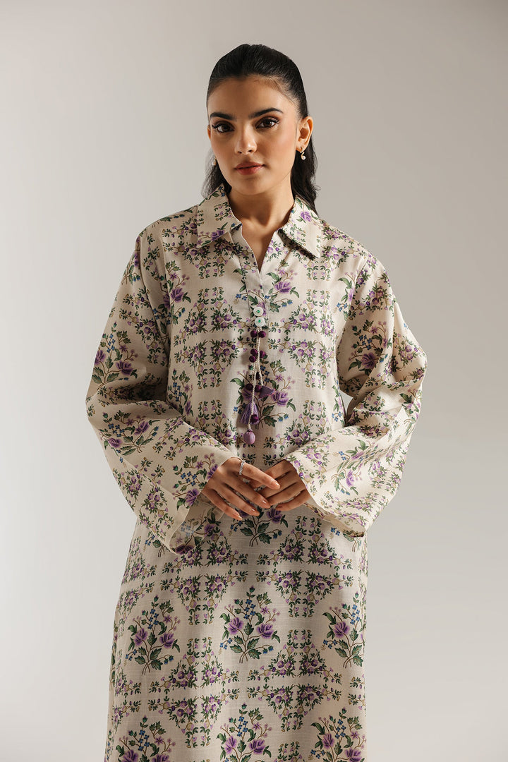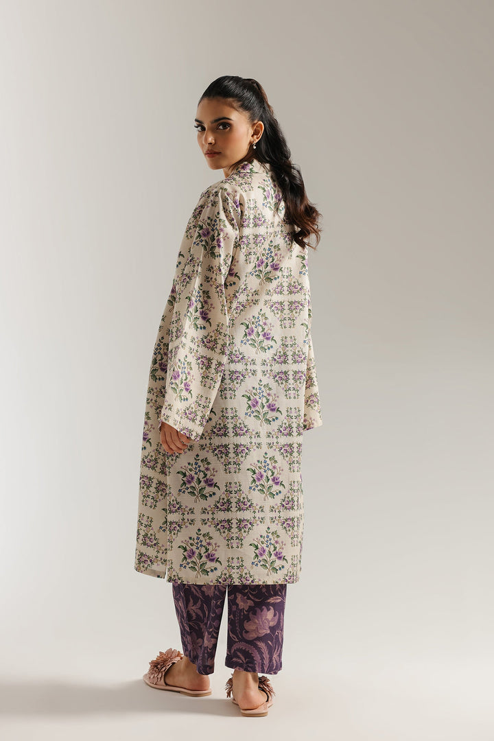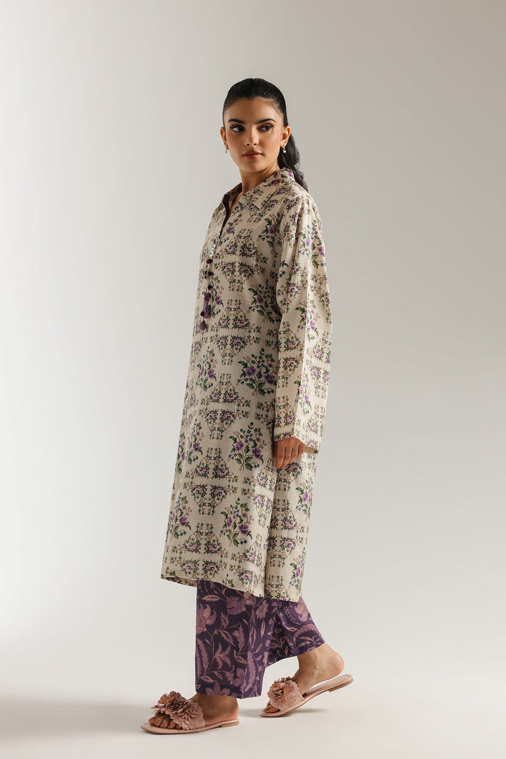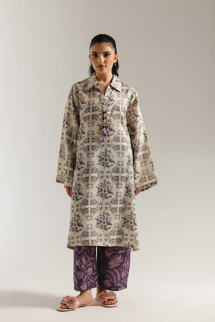A vision of blooming elegance. This charming suit features a printed kurti in a soft beige hue, adorned with a graceful floral print in shades of purple and green. The look is beautifully complemented by trousers in a deep purple, featuring a coordinating ornamental print. This ensemble is a celebration of elegant contrasts and artistic design, perfect for a chic and feminine style.