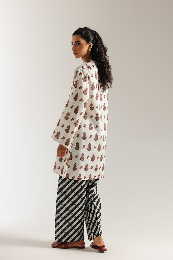 Inulge in a playful mix of patterns. This captivating suit features a beautiful, off-white shirt adorned with a delicate paisley print in muted red hues. The relaxed silhouette of the shirt is perfectly complemented by the wide-leg shalwar, which feature a bold, contrasting black-and-white striped pattern. This ensemble offers a unique and modern take on classic design, blending two distinct styles for a look that is both sophisticated and fun.