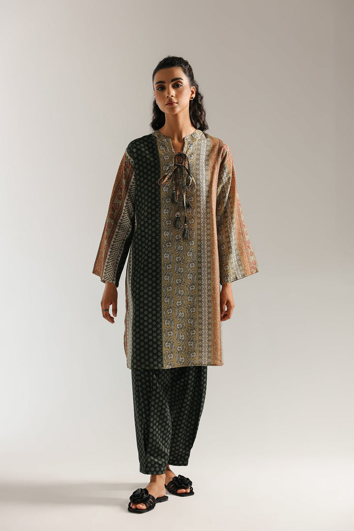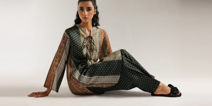 Experience the allure of mixed prints. This captivating printed suit features a unique split design on the shirt, with a blend of elegant botanical prints and geometric patterns in earthy olive and muted gold tones. Paired with coordinating patterned shalwar, the ensemble creates a harmonious and visually interesting look. This suit is a celebration of modern artistry and classic style, perfect for making a distinctive statement.