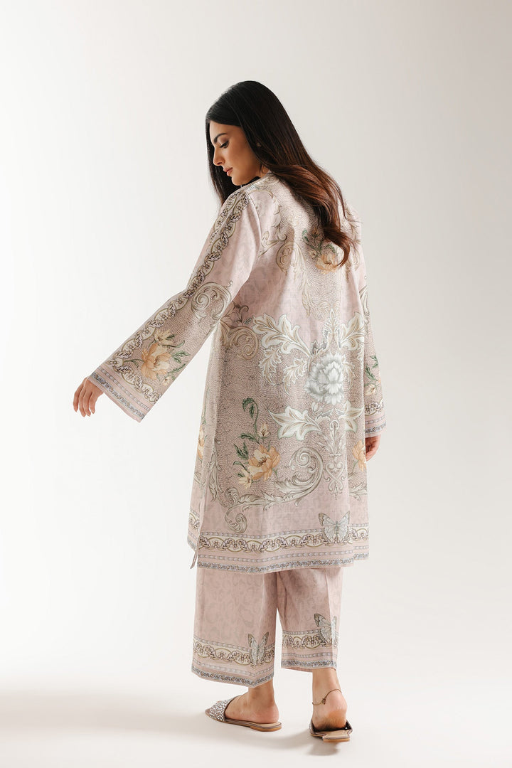 Indulge in sophisticated femininity with this gracefully printed pale coral suit. The ensemble features a shirt in a soft, blush pink hue, detailed with an exquisite all-over print. The print combines intricate baroque-style scrolls with large, subtle floral motifs in shades of gray, taupe, and pastel green. The top has a flattering V-neckline and wide, comfortable long sleeves. It is perfectly matched with tailored culotte trouser featuring a coordinating subtle border print on the hem. This suit creates a subtle, elegant look ideal for formal daytime events or a sophisticated evening out.