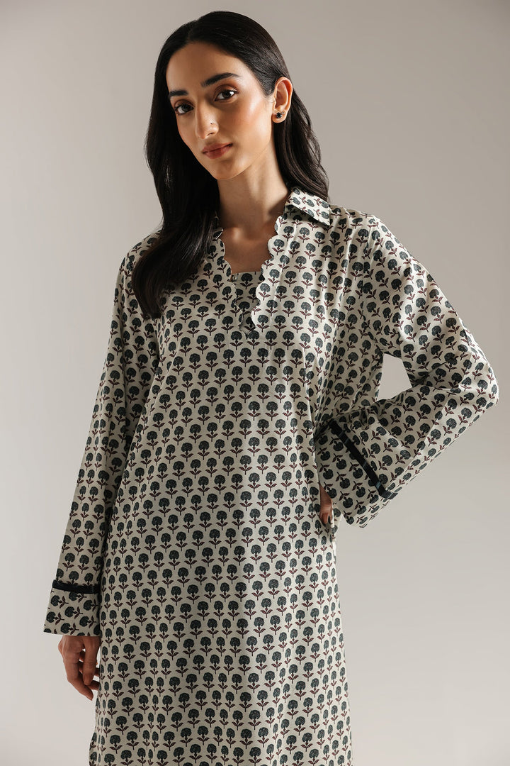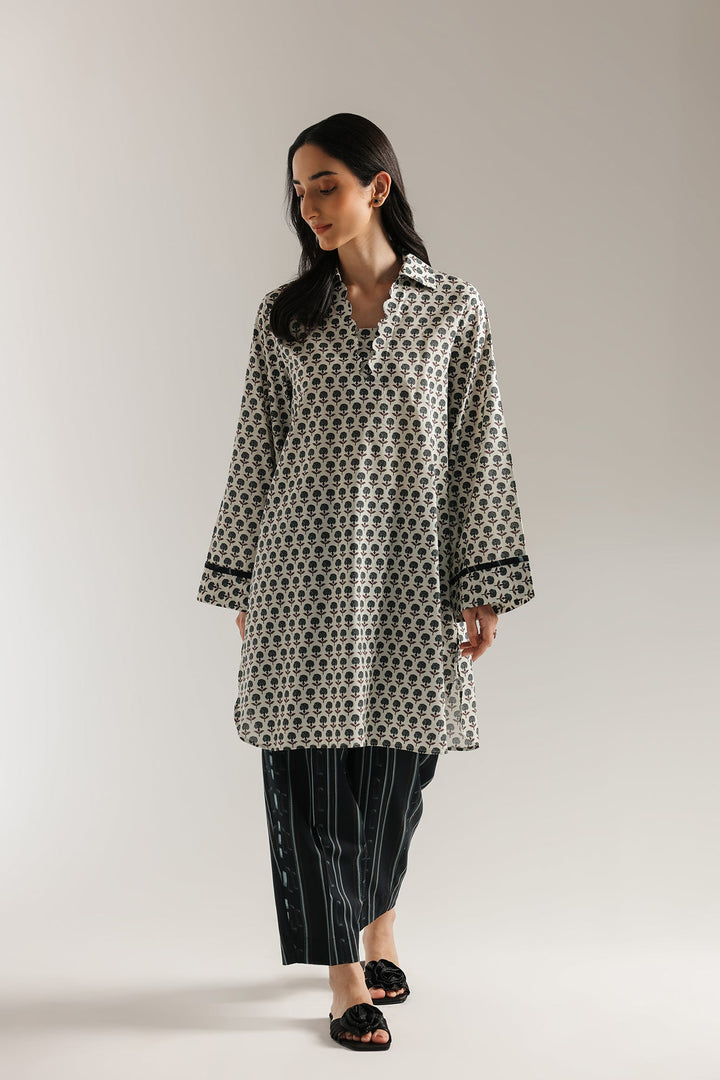 This printed suit features a shirt designed with an A-line fit, collar neck, flared sleeves, and a round hem for a flattering silhouette and comfortable movement. The matching trouser offers a slouchy fit and regular length, combining style with ease for a versatile, sophisticated look suitable for various occasions.