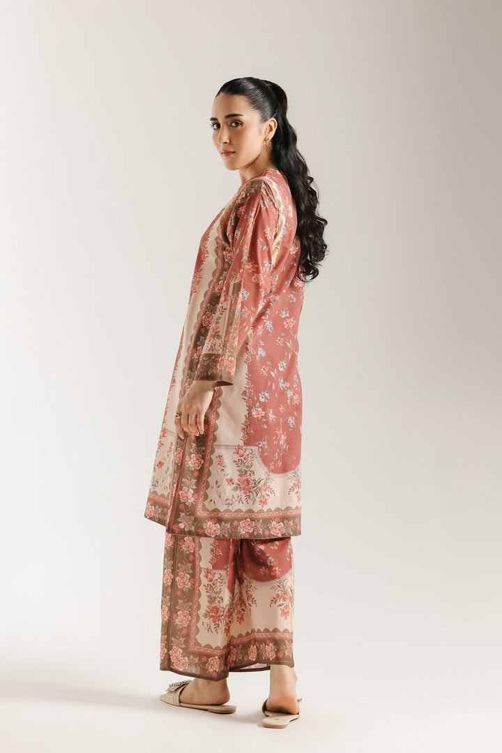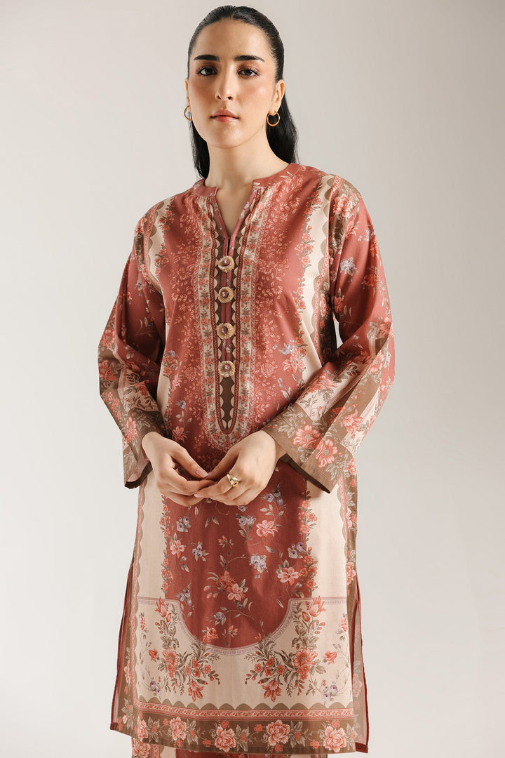 Escape into a world of artistic charm. This beautiful printed suit features a rust-colored fabric with an intricate all-over floral print in soft rose and cream hues. The relaxed fit silhouette of the shirt and the matching trousers creates a cohesive and sophisticated look. This ensemble is a perfect blend of modern comfort and artistic design.
