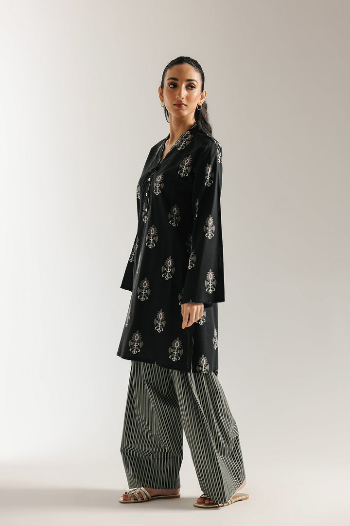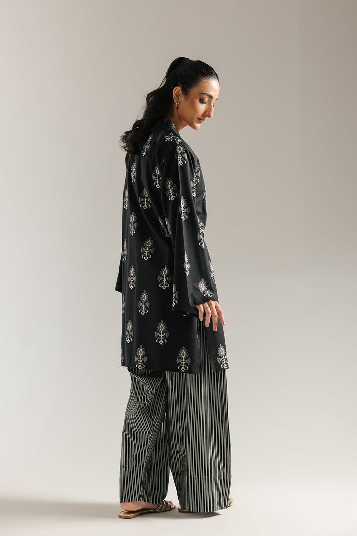 A study in sophisticated elegance, this suit is a mesmerizing fusion of patterns. The black kurti features an intricate, all-over ornamental print in a subtle grey, creating a look that is both delicate and bold. This striking shirt is perfectly balanced by a farshi shalwar, which feature a daring, vertical striped pattern that adds a modern edge. The harmony of these contrasting designs makes for a truly captivating and unique ensemble.