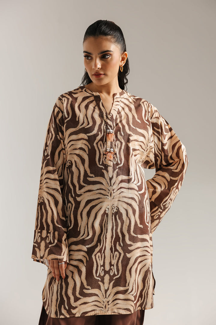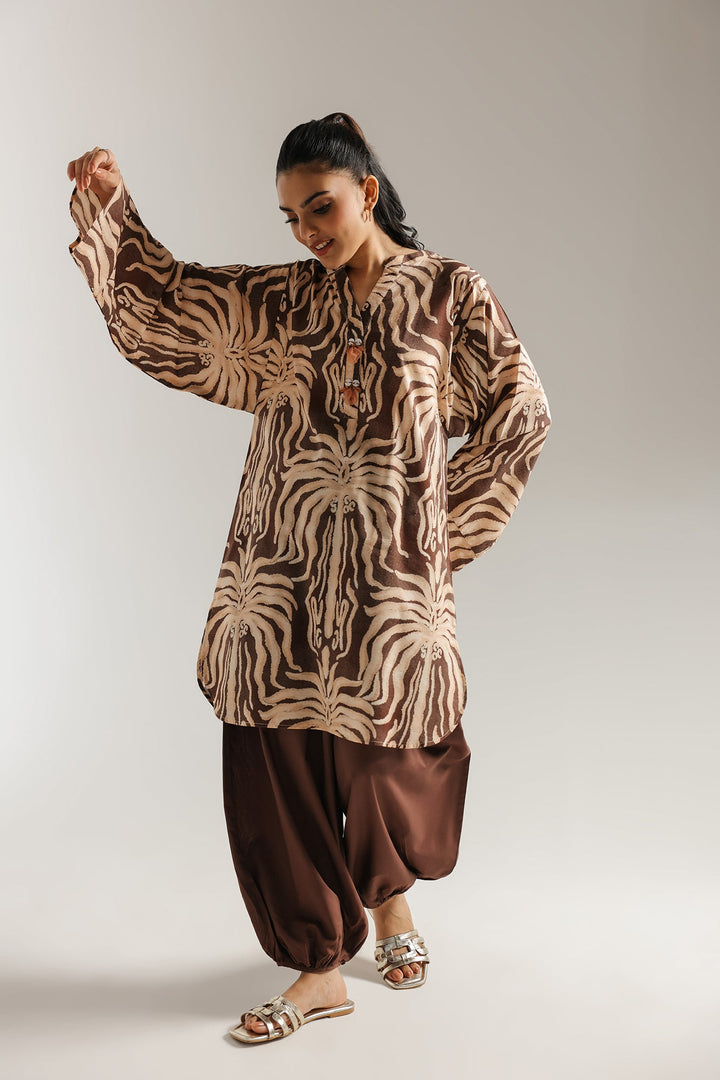 This captivating two-piece suit features a striking print and a comfortable, flowing silhouette. The long tunic is a rich blend of earthy brown tones, with a dynamic, abstract pattern that creates a sense of movement. It's designed with a relaxed V-neckline and full sleeves, offering a stylish yet effortless look. The tunic is perfectly complemented by a wide-legged shalwar in a deep brown hue, which drape beautifully making it a versatile choice for a chic day out or a special occasion.