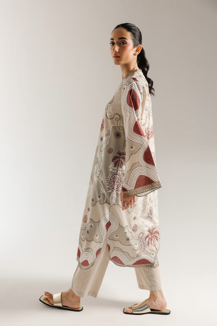 Step into a world of artistic wonder with this vibrant printed suit. This stunning two-piece ensemble is a true masterpiece of intricate design. The light beige base of the long shirt serves as a graceful canvas for the beautiful, geometric and stylized floral print in shades of red, white, and brown. The suit is completed with matching trouser, making it an ideal choice for any festive occasion or formal gathering.
