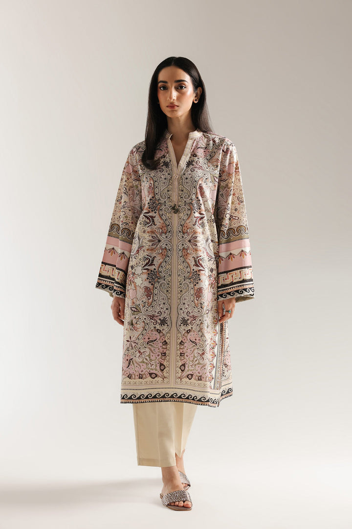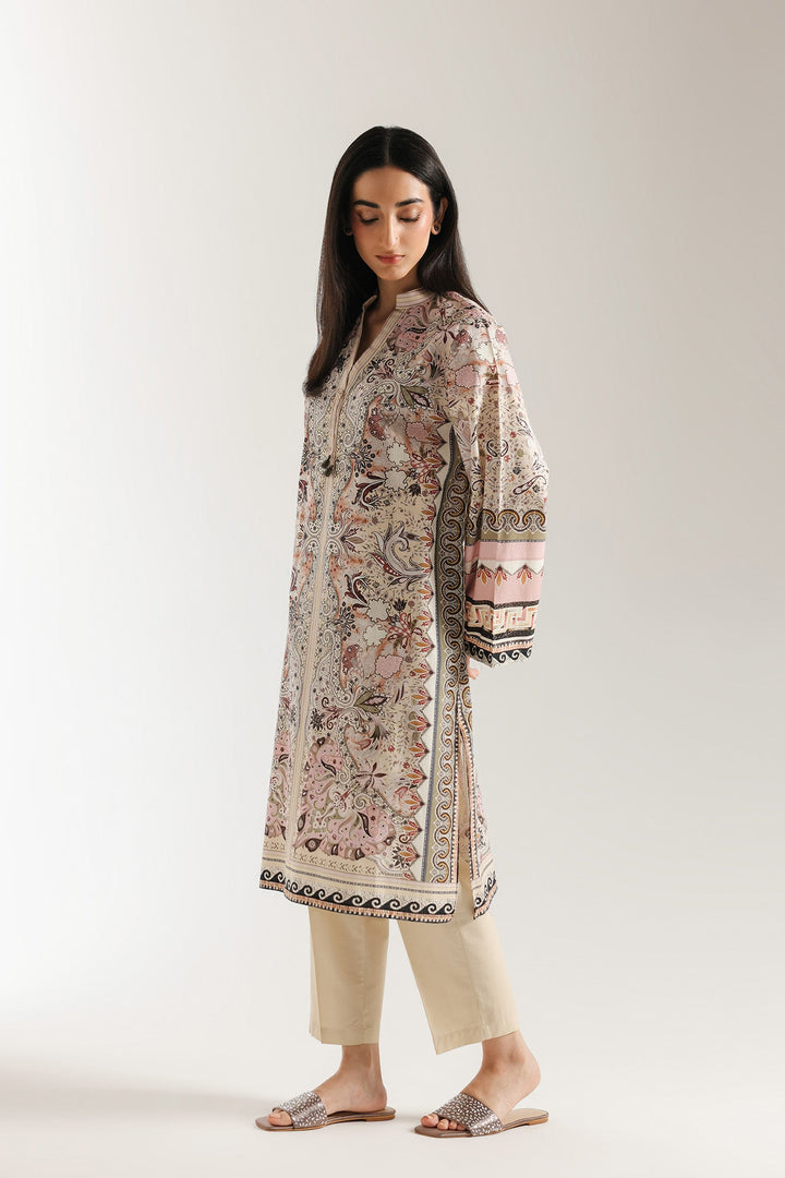 Wrap yourself in a look that is a masterpiece of intricate design and timeless elegance. This two-piece ensemble is crafted from a soft, light-colored fabric with a beautiful all-over paisley and floral print in shades of pink, off-white, and black. The long shirt has a comfortable, flowing silhouette, while the trouser feature a complementary solid color, creating a cohesive and captivating look. This outfit is perfect for any occasion.