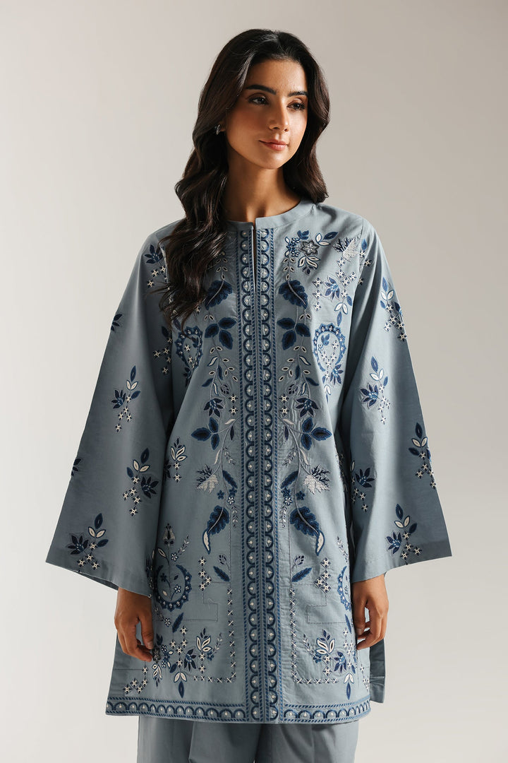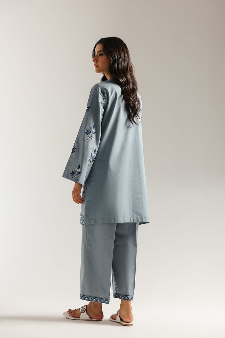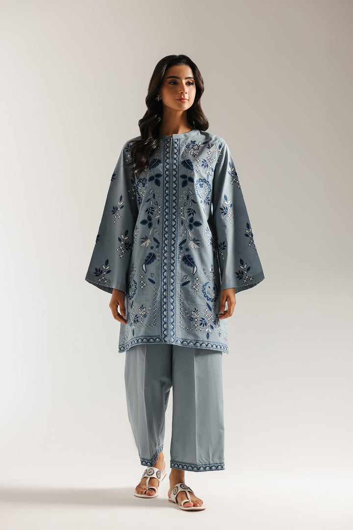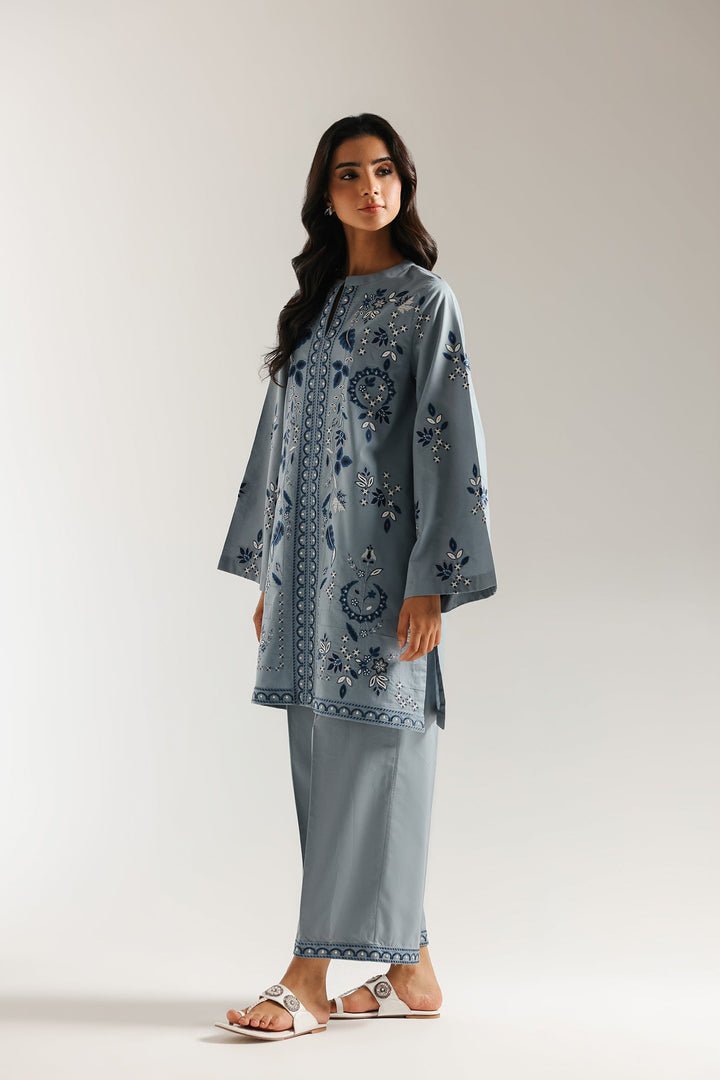 Grace yourself in this exquisite embroidered suit, a perfect blend of tradition and modern elegance. The shirt, in a sophisticated shade of dusty blue, is adorned with intricate floral embroidery in a darker blue and pristine white, creating a captivating pattern that cascades down the front. The round neckline with a subtle slit adds a contemporary touch to the classic silhouette. The set is completed with coordinating, wide-leg trouser that is both comfortable and chic. This ensemble is ideal for special occasions or an elevated day look, offering a serene and stylish aesthetic.