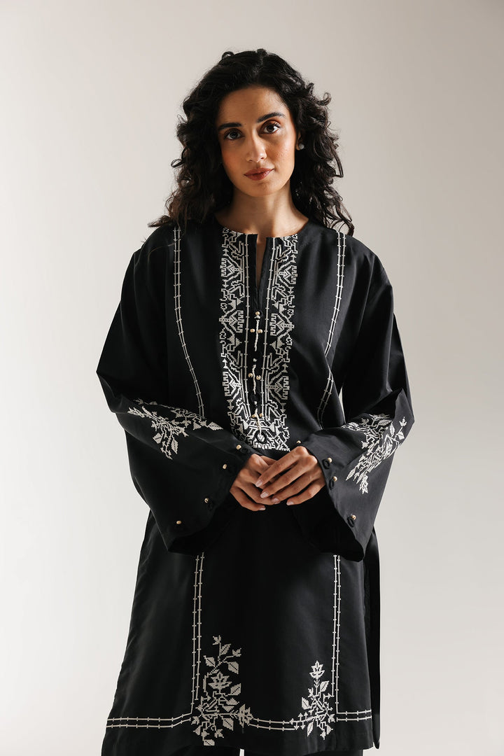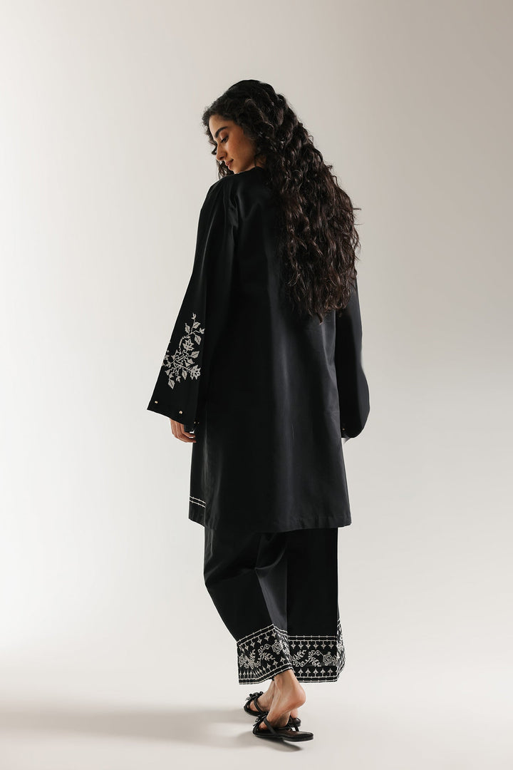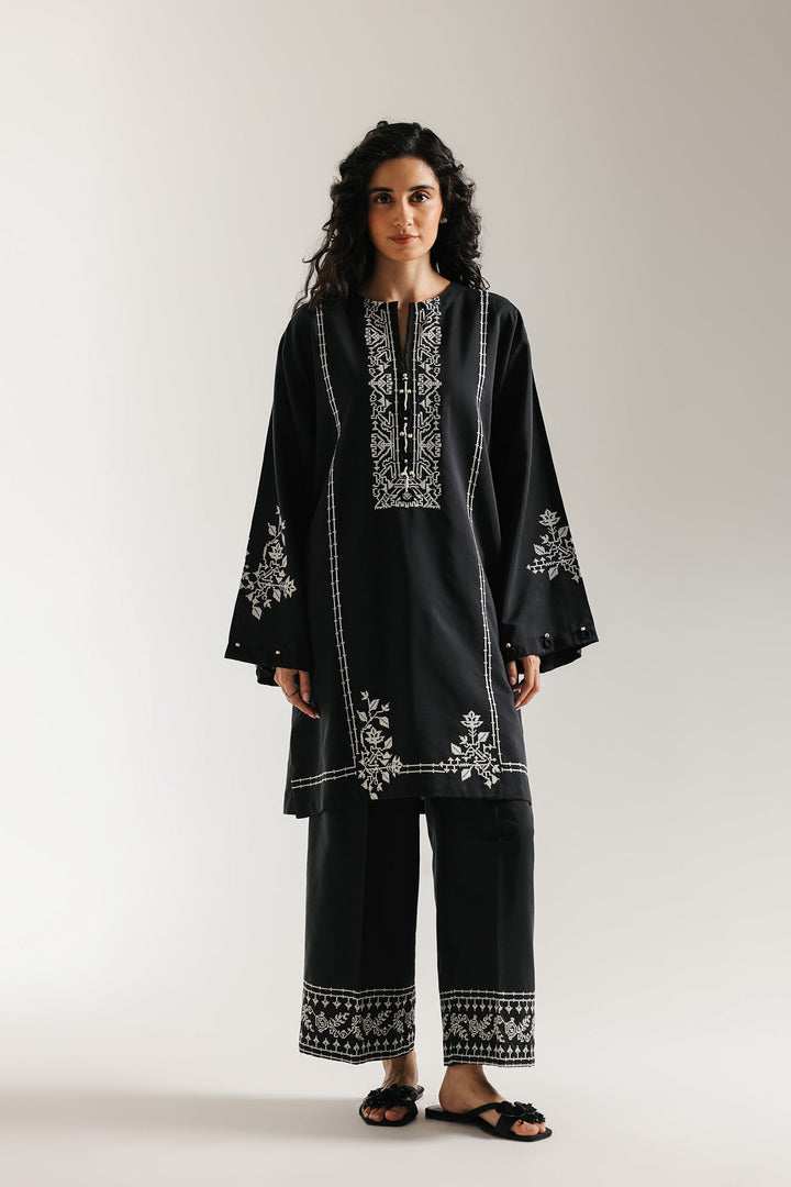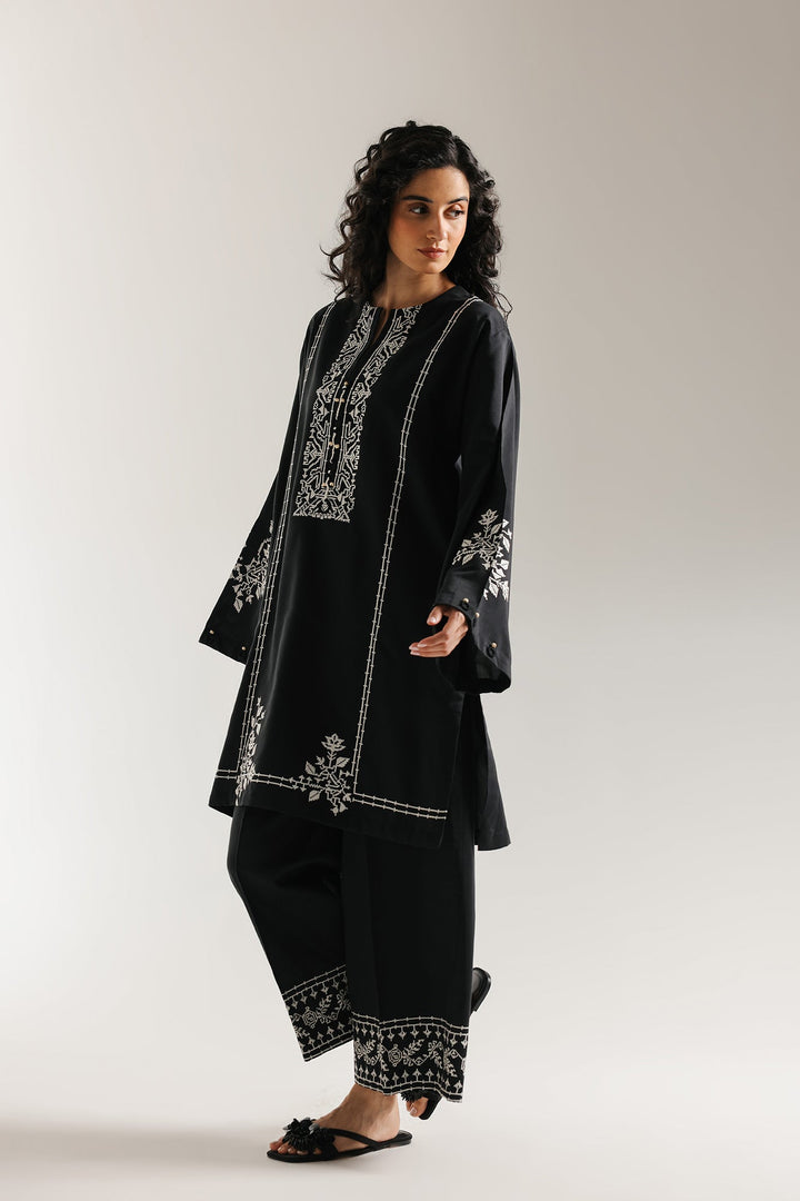 Step into sophisticated contrast with this striking black embroidered suit. The short, straight-cut kurta is crafted from a deep black fabric, providing a dramatic backdrop for the exquisite white thread embroidery. The intricate geometric and stylized floral patterns are concentrated around the V-slit neckline, run in elegant vertical panels down the front, and adorn the wide, flared sleeves. The ensemble is completed by coordinating straight-cut trousers in the same deep black, featuring a beautifully intricate embroidered border near the hem. This suit offers a powerful, elegant, and perfectly coordinated traditional look.