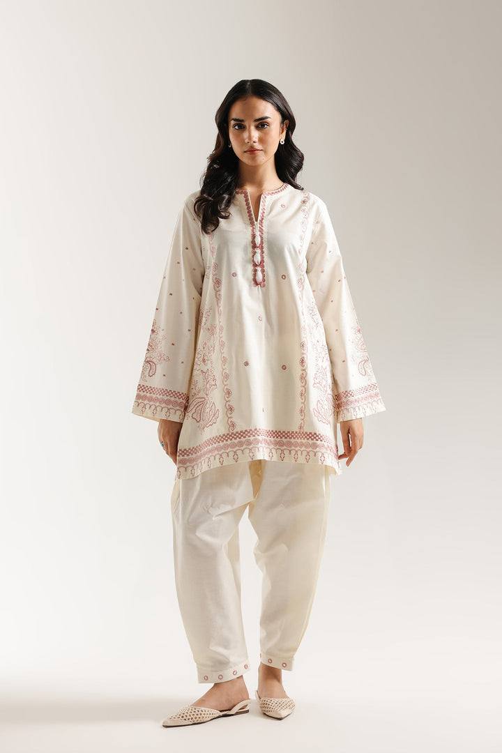 Envelop yourself in the delicate artistry of this serene embroidered suit. The beautiful off-white fabric is adorned with exquisite blush pink embroidery in traditional floral and paisley patterns that trace the neckline, hem, and cuffs of the A line kurta. The kurta features a sleek silhouette with a split V-neckline finished with subtle button details. The ensemble is perfectly complemented by voluminous yet tailored shalwar trousers in the matching off-white hue, creating a look that is both refreshingly light and deeply elegant.