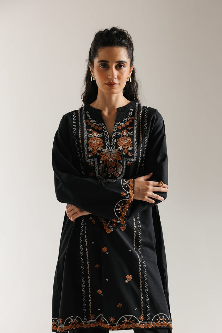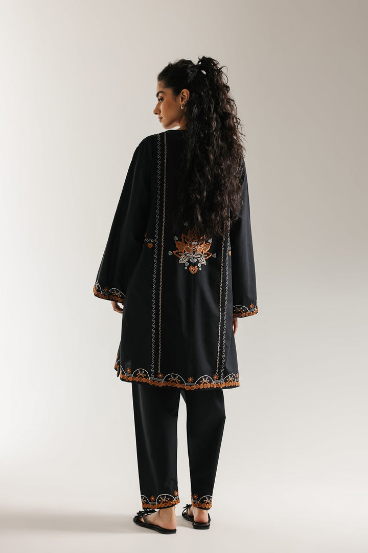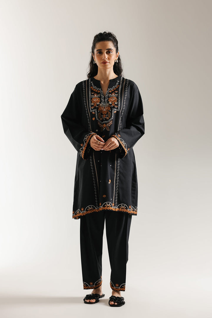 Envelop yourself in the rich artistry of this captivating black embroidered suit. The short, straight-cut kurta is crafted from a deep black fabric, creating a dramatic canvas. It features stunning, intricate thread embroidery in a traditional floral and ornamental pattern around the neckline in vibrant orange, gold, and subtle white. Scattered motifs and a detailed border in matching colors adorn the hem. The ensemble is completed by coordinating straight-cut shalwar in the same black fabric, featuring a matching embroidered border near the hem. This suit is a harmonious blend of classic elegance and bold color contrast