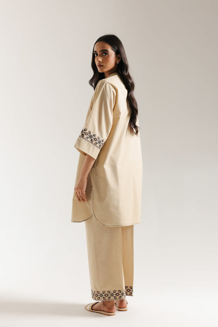 Unveil refined sophistication in this monochrome yellow beige embroidered suit. The short, straight-cut kurti is rendered in a soft beige fabric and features a delicate ban-collar neckline. It is richly adorned with geometric and stylized floral black and white thread embroidery running vertically down the center and finished with matching borders on the wide, three-quarter sleeves. The ensemble is completed by coordinating straight trouser with a single embroidered border at the hem, creating a perfectly balanced and polished look for any semi-formal event.