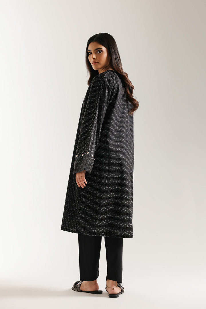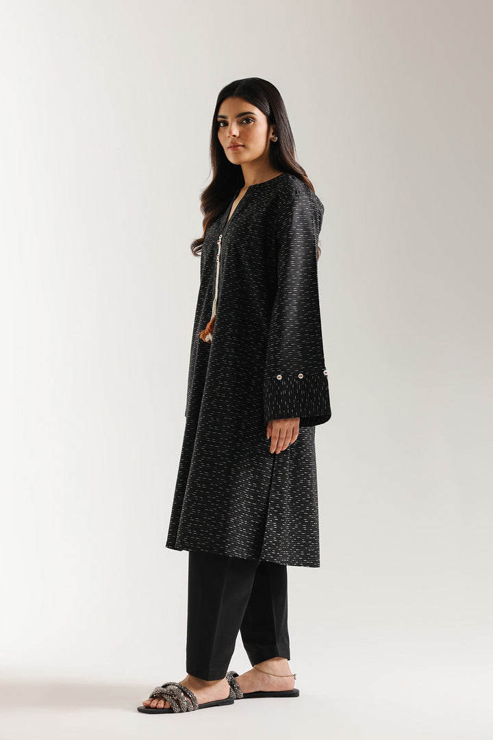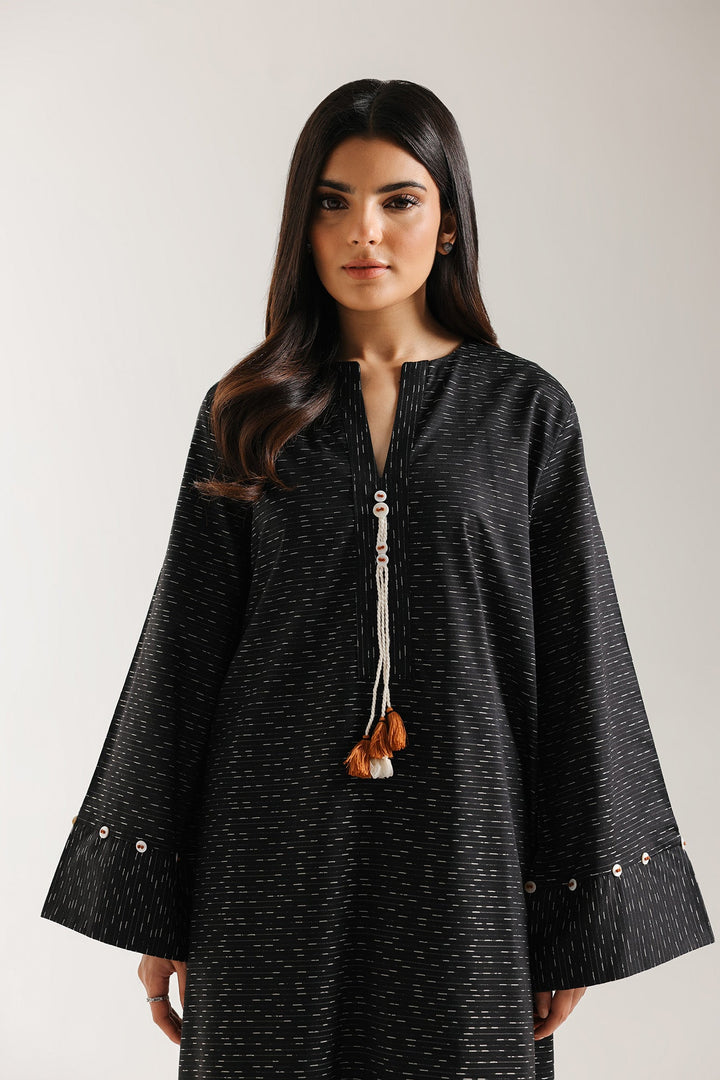 Achieve effortless sophistication in this modern black textured shirt. This comfortable, relax fit top features a simple round neckline and a subtle vertical line textured pattern in white across the black base. The design is accented by a stylized beaded tassel detail hanging from the neckline. The relaxed fit and deep black hue make this an incredibly versatile piece, perfect for pairing with loose fit shalwar for a chic daily look.