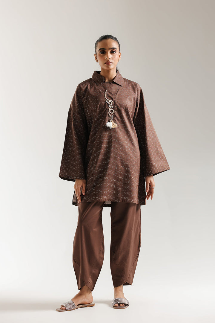 Embrace earthy tones and subtle texture with this stylish khaki solid suit. The relax fit kurti is crafted from a rich brown fabric with a delicate tonal striped texture, and features a classic collar. The unique appeal is further enhanced by an eye-catching dori accent with tassels adorning the neckline. Complementing the kurti is a coordinating comfy trouser in a solid khaki brown, creating a cohesive and elegantly modern traditional look perfect for sophisticated daily wear.