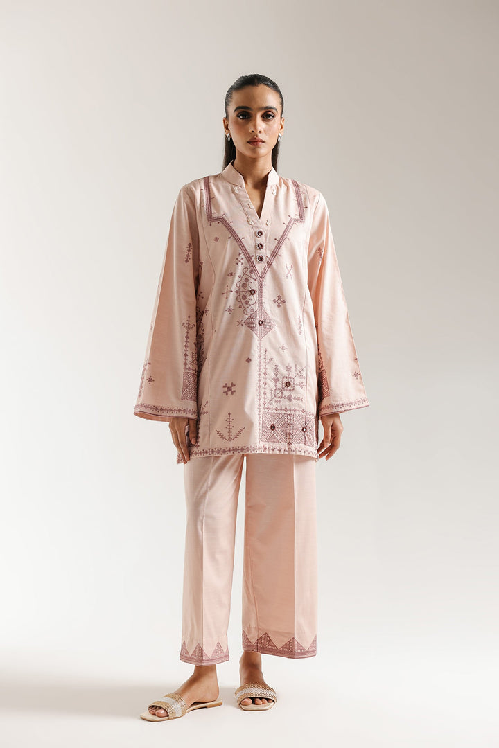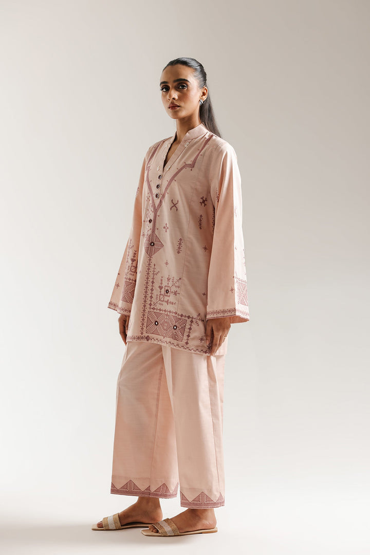 Exude grace in blush pink with this beautifully detailed embroidered suit. The straight-cut kurti is crafted from a soft pink fabric and features exquisite tonal and contrasting thread embroidery in tribal and geometric patterns across the front, creating a striking traditional focal point. The kurti has a relaxed fit with wide sleeves and a simple V-neckline. Completing the monochromatic look is matching straight trouser with a subtle embroidered border detail at the hem. This suit offers a sophisticated and delicate charm for any event.