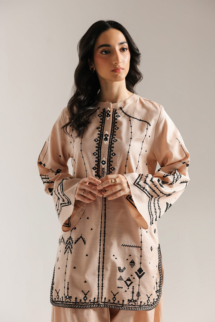 Discover the serene elegance of this beautiful embroidered suit. This two-piece ensemble is a true masterpiece of intricate design. The soft peach base of the shirt serves as a graceful canvas for the elaborate black geometric and floral embroidery. The detailed patterns on the neckline, front, and sleeves create a truly mesmerizing look. The suit is completed with matching shalwar, making it a perfect choice for any occasion.