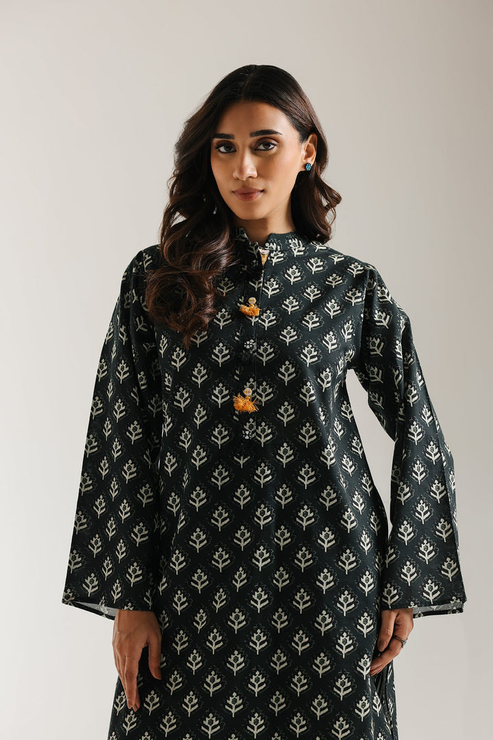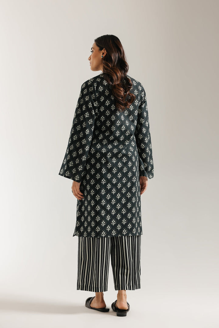 Infuse your wardrobe with bold, graphic style with this striking black printed suit. The short, straight-cut kurta features a distinctive, seamless white leaf motif print. It is designed with a classic band collar and a subtle slit neckline, highlighted by three eye-catching orange-yellow accents. The top is beautifully contrasted by the coordinating trouser, which feature a bold black and white vertical stripe pattern. This mixed-print set creates a chic, modern, and high-impact traditional look. -Black Color -Stitched Article -2 piece