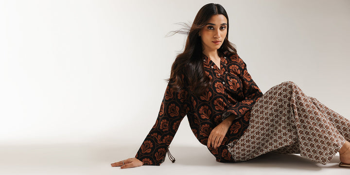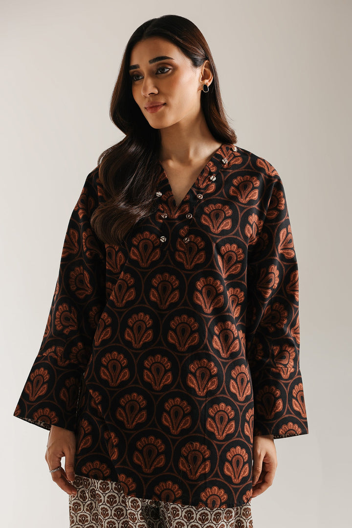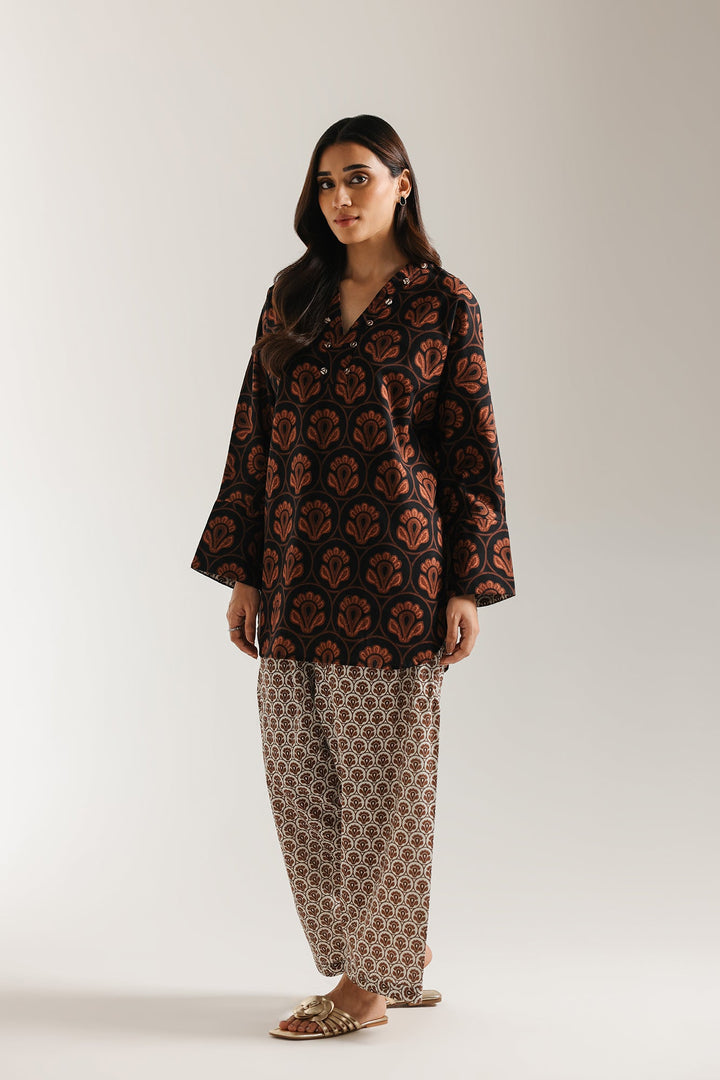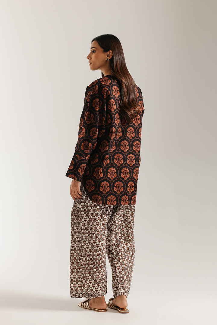 Channel warm, bohemian energy with this richly patterned black and brown printed suit. The short, straight-cut kurta features a striking fan/scallop motif print in deep black and earthy burnt orange tones. It has a classic V-slit neckline with a band collar, accented by buttons. The top is beautifully contrasted by the wide-leg shalwar, which feature a fine, all-over geometric or circular pattern in rich brown and cream. This compelling mix of graphic patterns creates a unique, statement-making traditional look. -Black Color -Stitched Article -2 piece