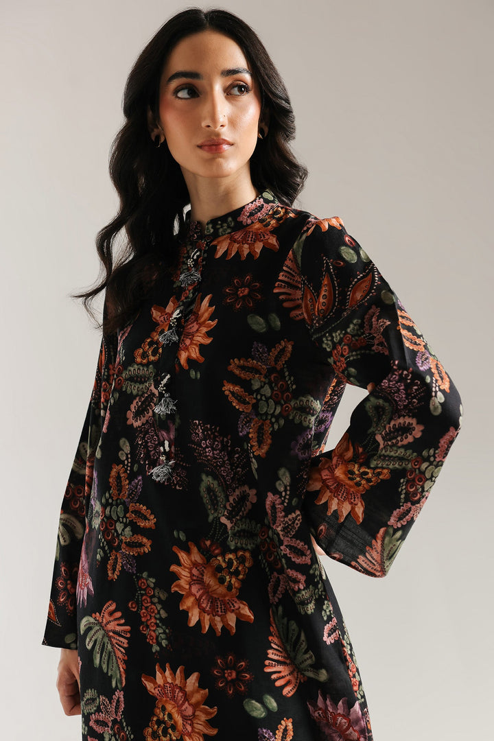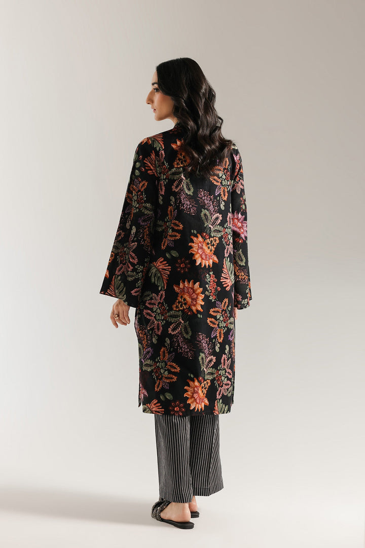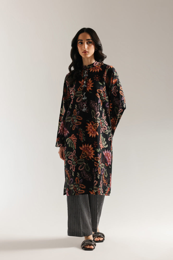 Embrace a modern look with this stunning printed suit. This two-piece ensemble is a masterpiece of intricate design. The rich black base of the long shirt serves as a dramatic canvas for the beautiful, multi-colored floral and vine print in shades of pink, orange, green, and white. The suit is completed with contrasting striped trousers, making it an ideal choice for any festive occasion or formal gathering.