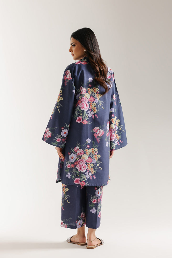 Adorn yourself in the beauty of a garden with this striking navy blue printed suit. The set features a shirt in a rich, dark navy blue fabric, completely blanketed in an all-over vivid floral print. The print showcases large, realistic blooms in shades of blush pink, mauve, yellow, and green. The shirt has a flattering V-neckline and wide, comfortable sleeves. It is perfectly paired with coordinated culotte trouser in the matching floral print. This bold and beautiful ensemble is ideal for a vibrant, coordinated look at any social or festive occasion.