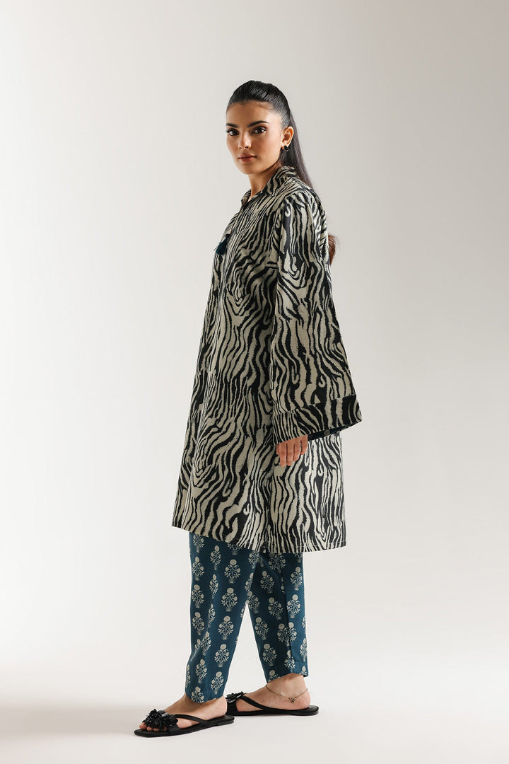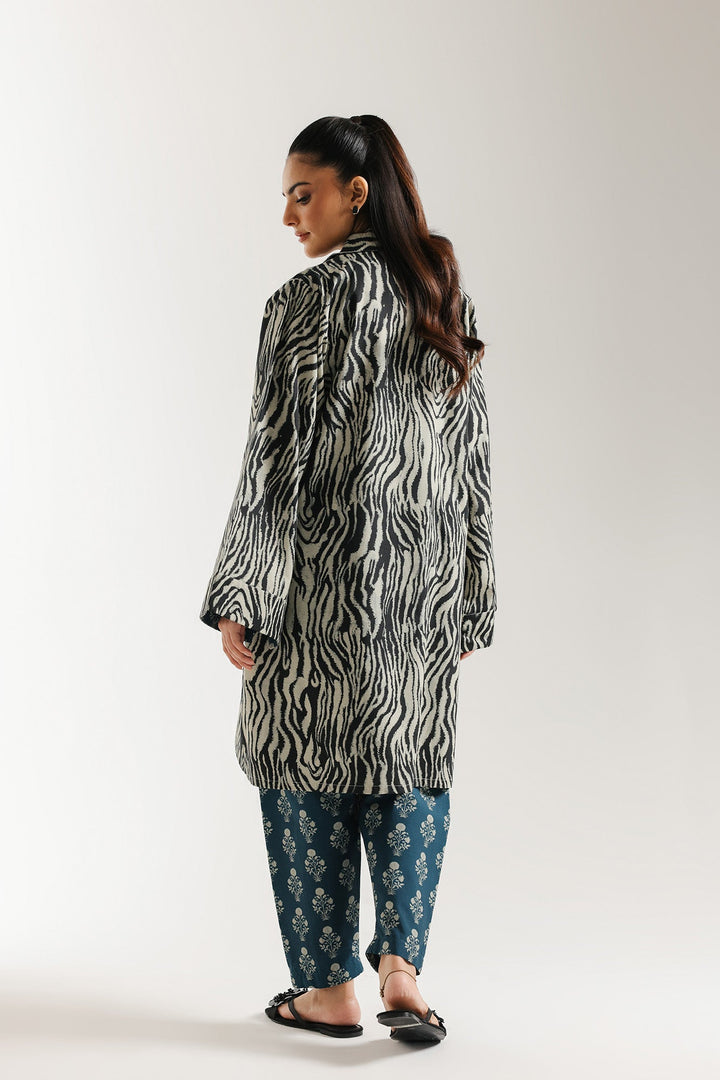 Command attention with this bold and artistic printed suit. The ensemble features A line shirt with a dynamic black and off-white wavy, abstract print, reminiscent of animal stripes or fluid movement. The shirt has a structured V-neckline with a pointed collar and wide, comfortable long sleeves. It is beautifully contrasted with straight fit shalwar in a dark teal or navy blue, adorned with an all-over, light-colored floral block print. This striking mix-and-match look is ideal for the fashion-forward woman looking for a contemporary statement outfit.