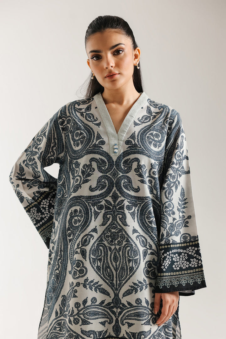 Command a look of understated drama with this striking monochrome printed suit. The ensemble features a shirt in a soft white or light gray base, showcasing an intricate all-over damask and paisley print in contrasting deep navy or black. The shirt design includes, a flattering V-neckline with button accents, and wide, comfortable long sleeves, all finished with patterned borders. This bold top is paired with tailored shalwar in a solid, pale gray or white. The rich, detailed print combined with the clean silhouette makes this a sophisticated and effortlessly chic outfit for any modern woman.