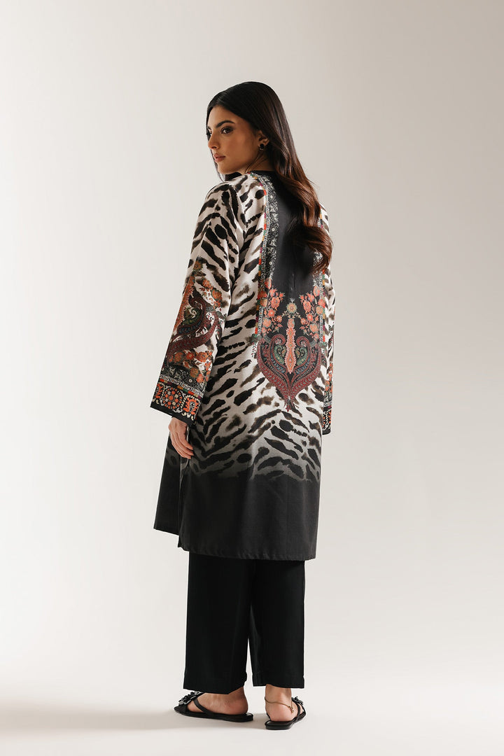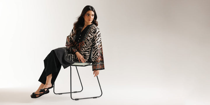 Harness the power of contrast with this dramatic black and white printed suit. The ensemble features a shirt with a bold abstract print across the body and sleeves, with stylized animal print like zebra stripes. Overlaid on the front yoke is a vibrant traditional motif print, showcasing detailed paisley and geometric designs in rich shades of orange, green, and deep red, creating a striking focal point. The shirt has a band collar, and wide, flowing sleeves. It is finished with a solid black hem and paired with tailored culotte trouser in solid black. This sophisticated suit is perfect for an edgy yet traditional statement.
