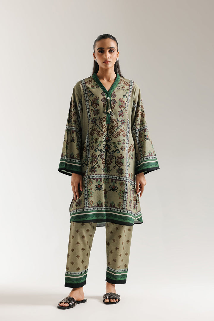 Capture rich, earthy style with this captivating grass green printed suit. The straight-cut kurti is adorned with an elaborate all-over print featuring stylized paisleys and borders in complementary shades of green, rust, and black. The V-neckline is accented with a delicate tassel detail, and the wide sleeves finish with a contrasting dark green border. Completing the ensemble is coordinating shalwar featuring a subtle geometric pattern, offering a perfectly coordinated and stylish look for everyday elegance.
