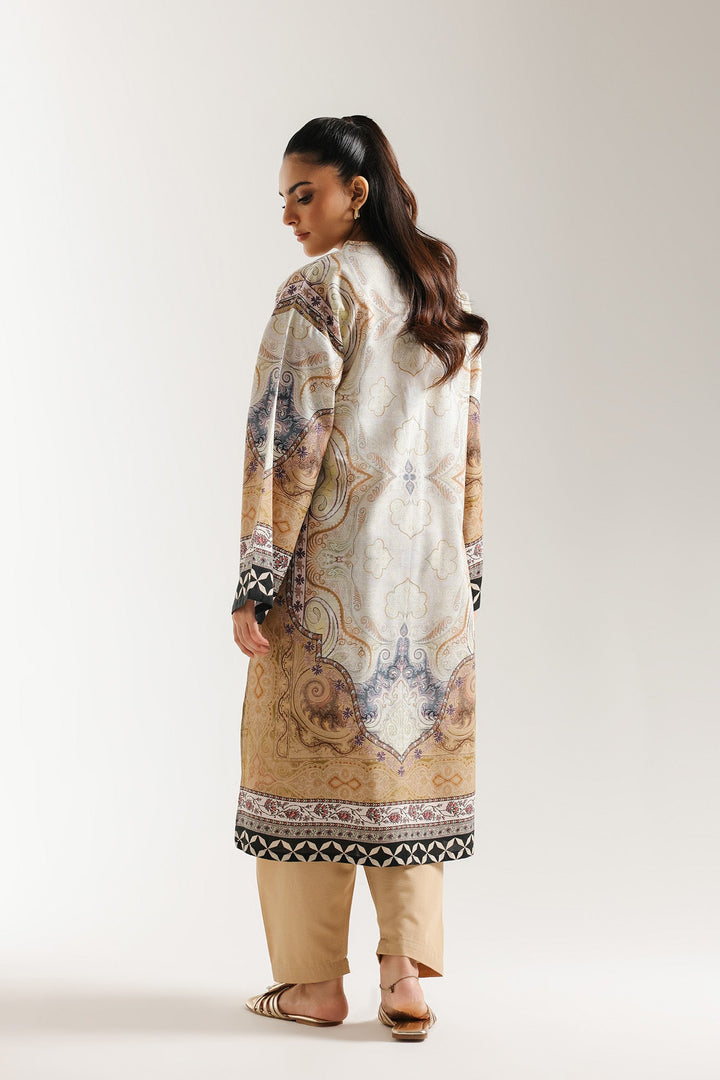 Channel sophisticated neutrals with this beautifully patterned printed suit. The ensemble features a long kurti in a soft, light base, covered in a complex all-over ornamental print. The print utilizes a warm palette of beige, tan, lavender, and subtle ochre, with stylized damask, paisley, and geometric elements. The shirt has a comfortable V-neckline and wide, flowing sleeves finished with a striking black and white chevron border. It is paired with loose fit shalwar in a solid, coordinating camel or beige shade. This ensemble offers a refined and artistic look for any stylish outing.