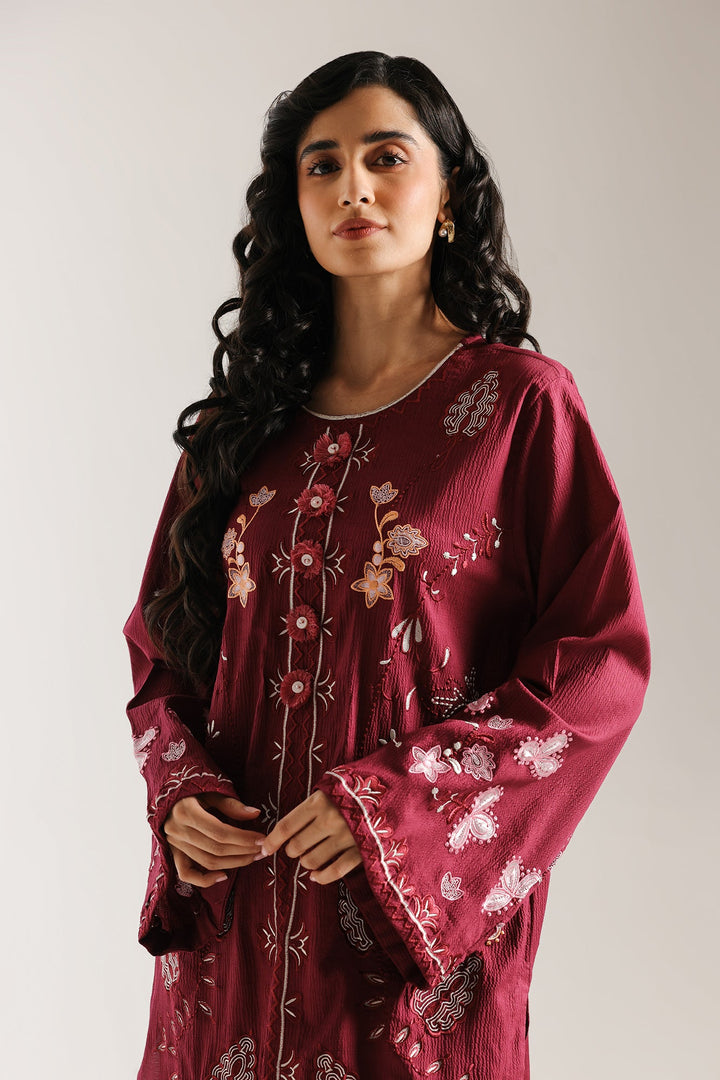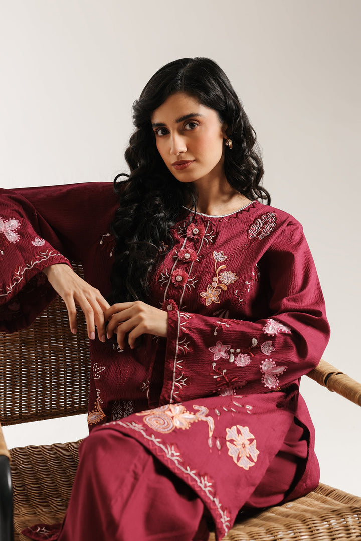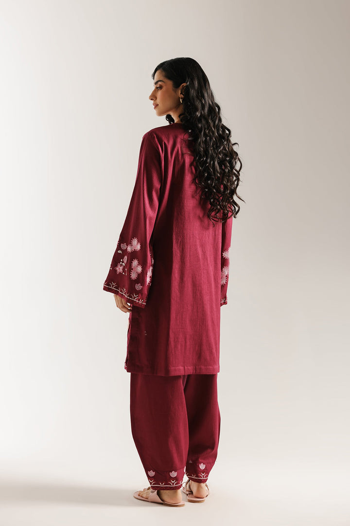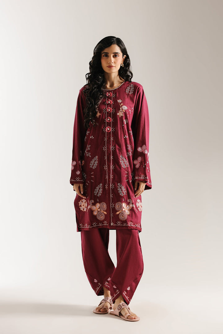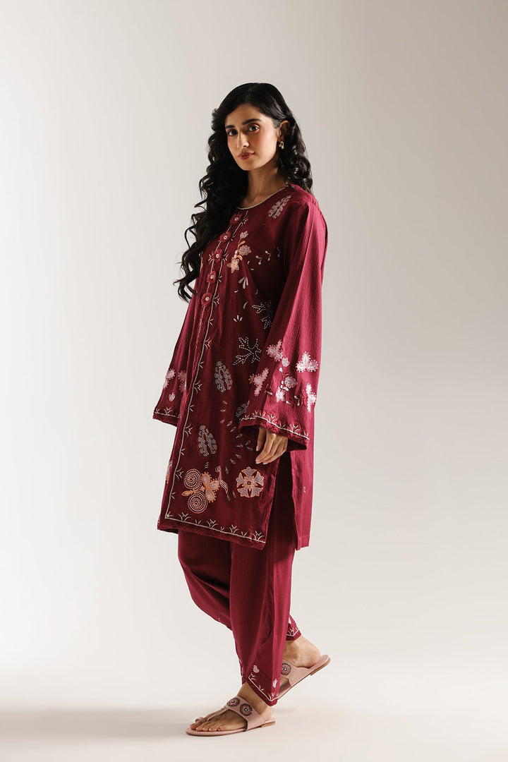 Elevate your wardrobe with this stunning embroidered suit. This two-piece ensemble features a rich violet kurta, beautifully adorned with delicate floral and vine embroidery in contrasting white, pink, and green threads. The intricate patterns cascade down the front and sleeves, creating a captivating visual. Paired with coordinating shalwar, this suit offers a harmonious and elegant look, perfect for any occasion where you want to make a sophisticated statement.
