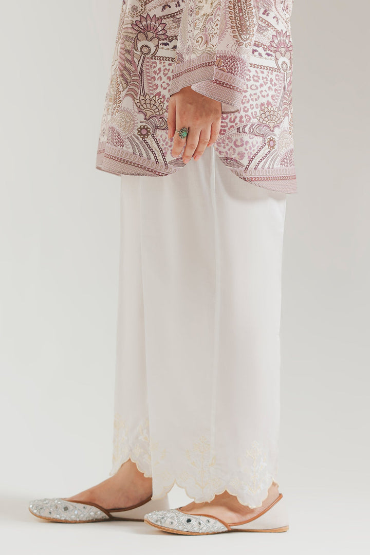 Unveil refined elegance with these crisp white embroidered trousers. These tailored straight-cut trousers are crafted from a soft, white fabric. The focal point is the delicate cutwork embroidery at the hem, featuring an intricate floral and scalloped lace pattern in a complementary tone. These versatile trousers offer a polished finish and pair beautifully with printed or embroidered shirts.