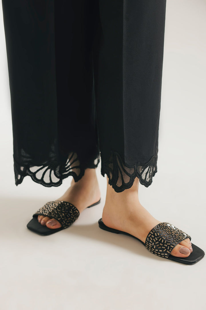 Make a stunning style statement with this perfectly tailored black trouser. This classic straight-cut trouser is rendered in a deep black fabric. The defining feature is the beautiful hem, which is finished with an elaborate scalloped cutwork border. The intricate cut-out design creates a delicate and artistic edge, elevating this trouser from simple bottom to a sophisticated focal point for any traditional or fusion ensemble.