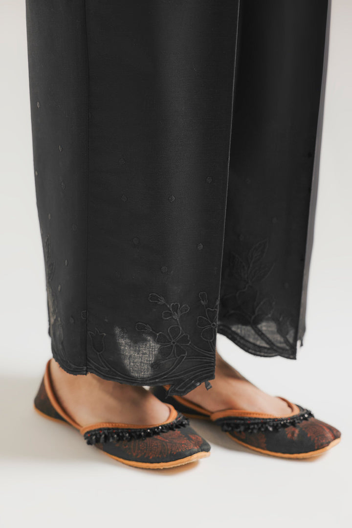 Unveil refined elegance with these crisp black embroidered trousers. These tailored straight-cut trousers are crafted from a classic, black fabric. The focal point is the delicate cutwork embroidery at the hem, featuring an intricate floral and scalloped lace pattern in a complementary tone. These versatile trousers offer a polished finish and pair beautifully with printed or embroidered shirts.