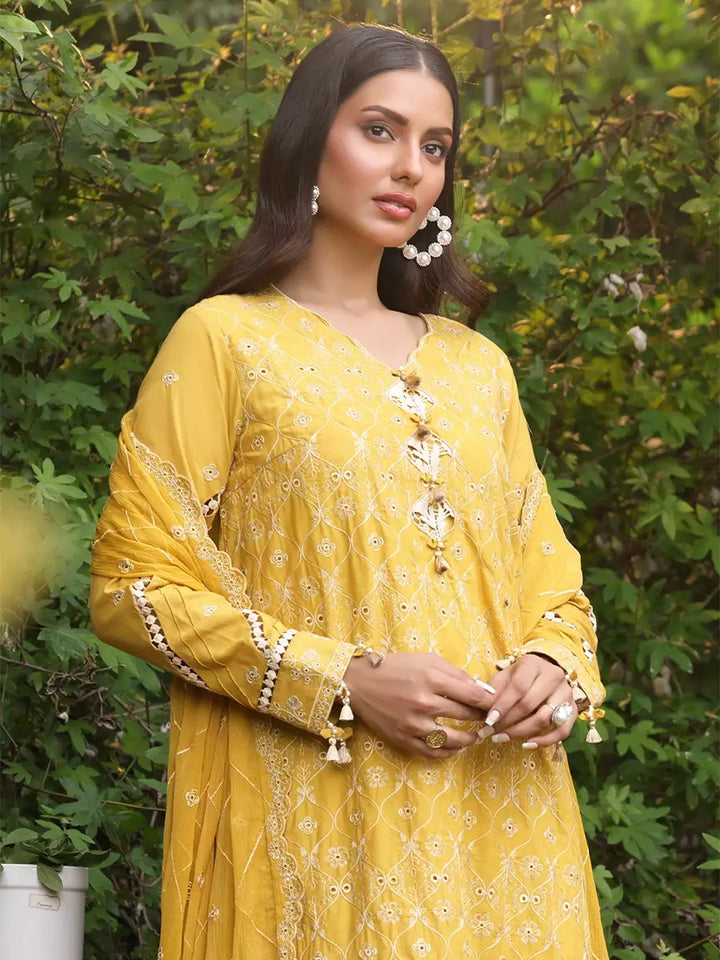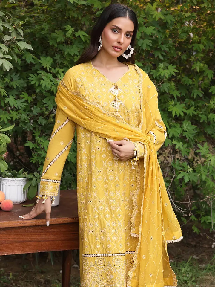 Make a bold statement with our mustard chikankari outfit, featuring intricate embroidery and a stylish chiffon dupatta—perfect for a striking and chic appearance