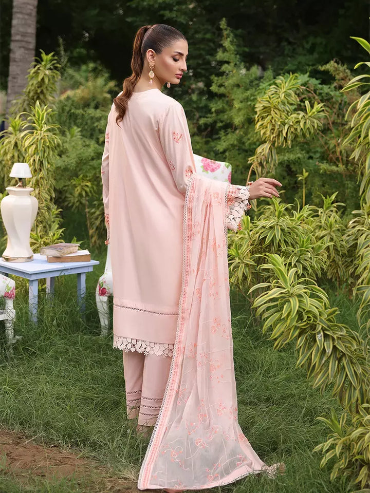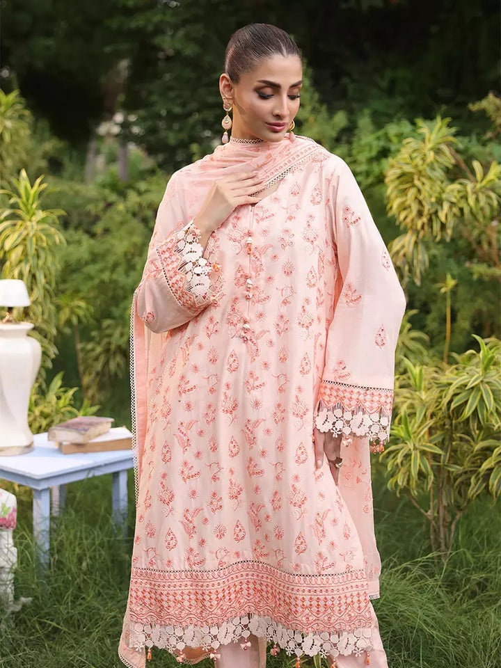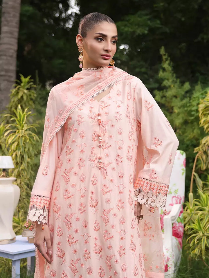 Step into soft elegance with our baby pink cambric dyed 3-piece, delicately adorned with chikankari embroidery—perfect for a graceful daytime look