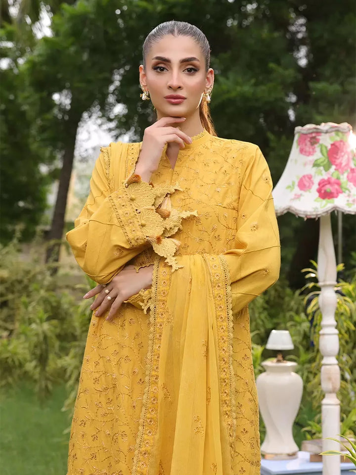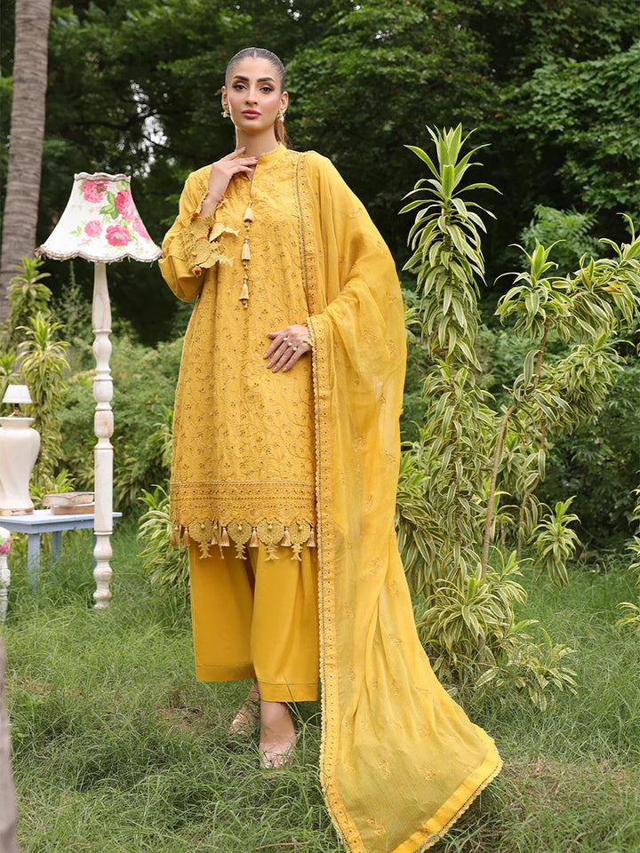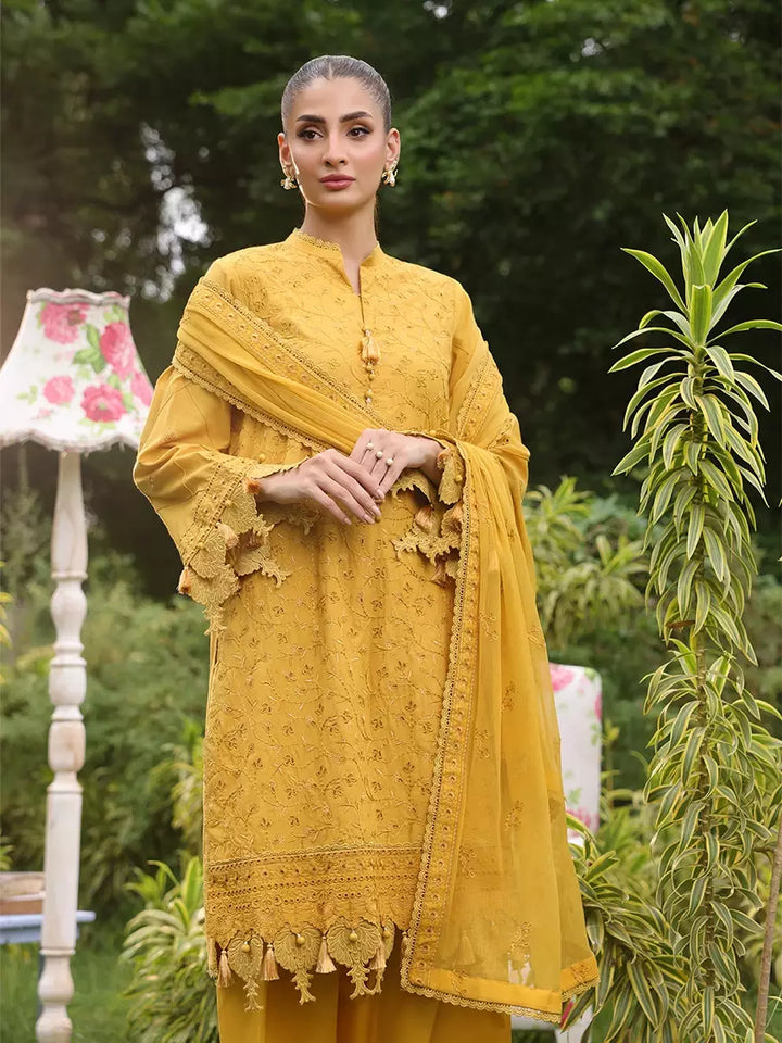 Radiate joy with our yellow cambric dyed 3-piece, adorned in graceful chikankari embroidery—perfect for a bright and cheerful daytime look