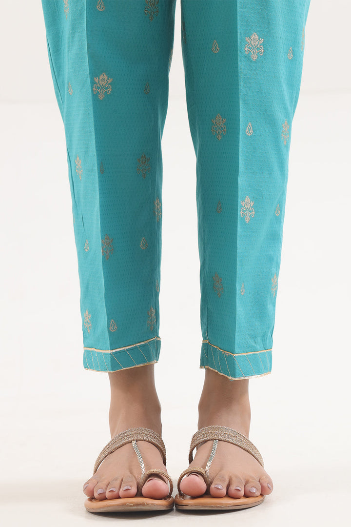 Cotton Jacquard Pants By SAYA Crafted From Premium Jacquard Cotton That Balances Softness With A Subtle Textured Weave. The Sea Green Hue Evokes Freshness And Versatility, Making These Pants Ideal For Daytime Soirées Or Refined Casual Looks. Finely Tailored With Crisp Seams, A Comfortable Waistband, And A Polished Finish, These Pants Offer Style Without Sacrificing Comfort. A Thoughtful Bottom Piece That Elevates Solid Tops, Prints, Or Coordinated Ensembles With Ease.