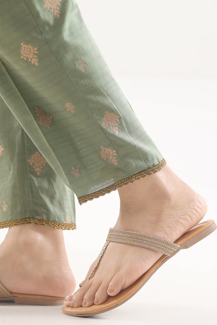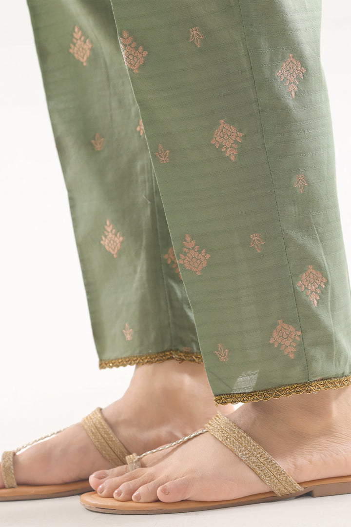 Experience The Subtle Luxury Of The SAYA Cotton Jacquard Pants, Meticulously Tailored In Premium Jacquard Cotton That Blends Breathability With Chic Texture. The Woven Jacquard Pattern Adds Visual Depth Without Overpowering The Look. Featuring A Straight Cut Silhouette With A Comfortable Waistband, These Pants Deliver A Flattering Draped Fit That Moves With You. Available In A Soft Off-White Hue, They Pair Seamlessly With Embellished Shirts, Printed Kurtas, Or Minimal Tops For A Balanced Ensemble. Versatile For Daytime Wear, Semi-Formal Gatherings Or Casual Chic Settings, This Piece Embodies Fabric Quality, Design Finesse, And Everyday Practicality.