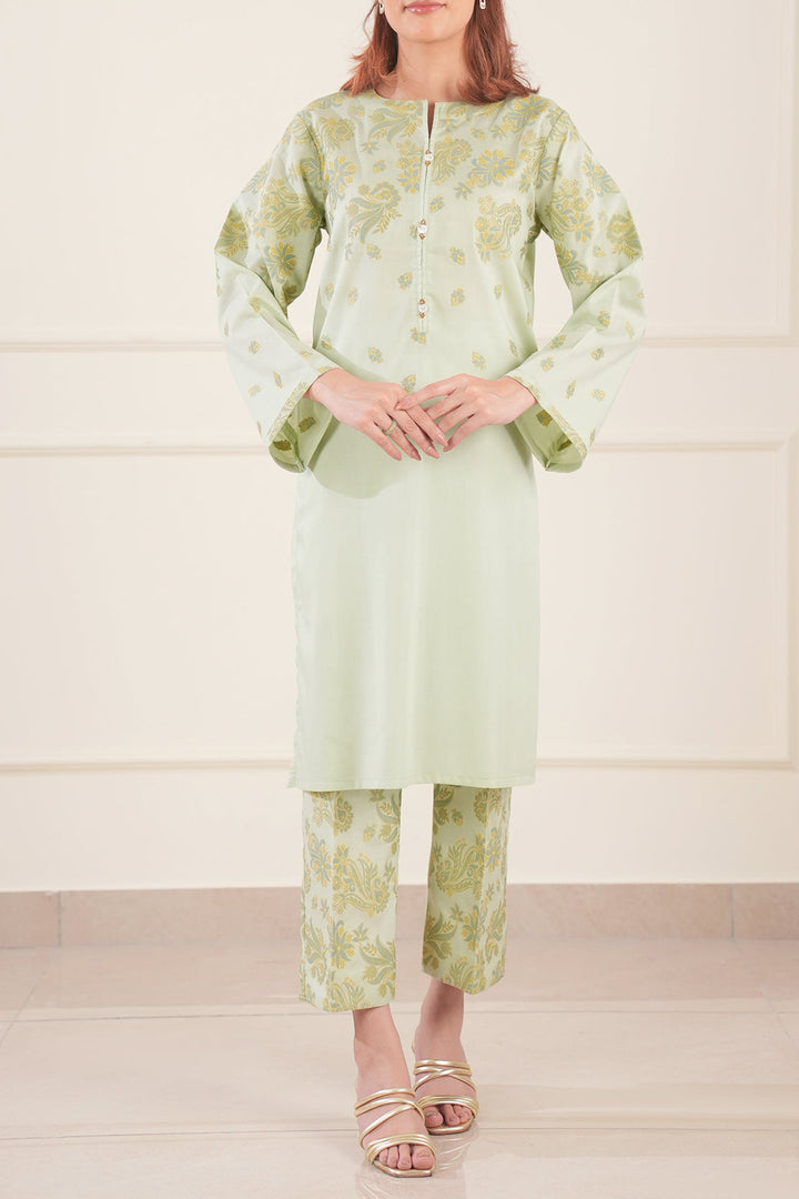 Exude elegance with Saya.pk's Cotton Jacquard Stitched 2-Piece Suit. Featuring a meticulously crafted jacquard shirt and matching trouser, this outfit is perfect for formal and semi-formal occasions. Its premium fabric ensures comfort, style, and a luxurious feel for a sophisticated look.
